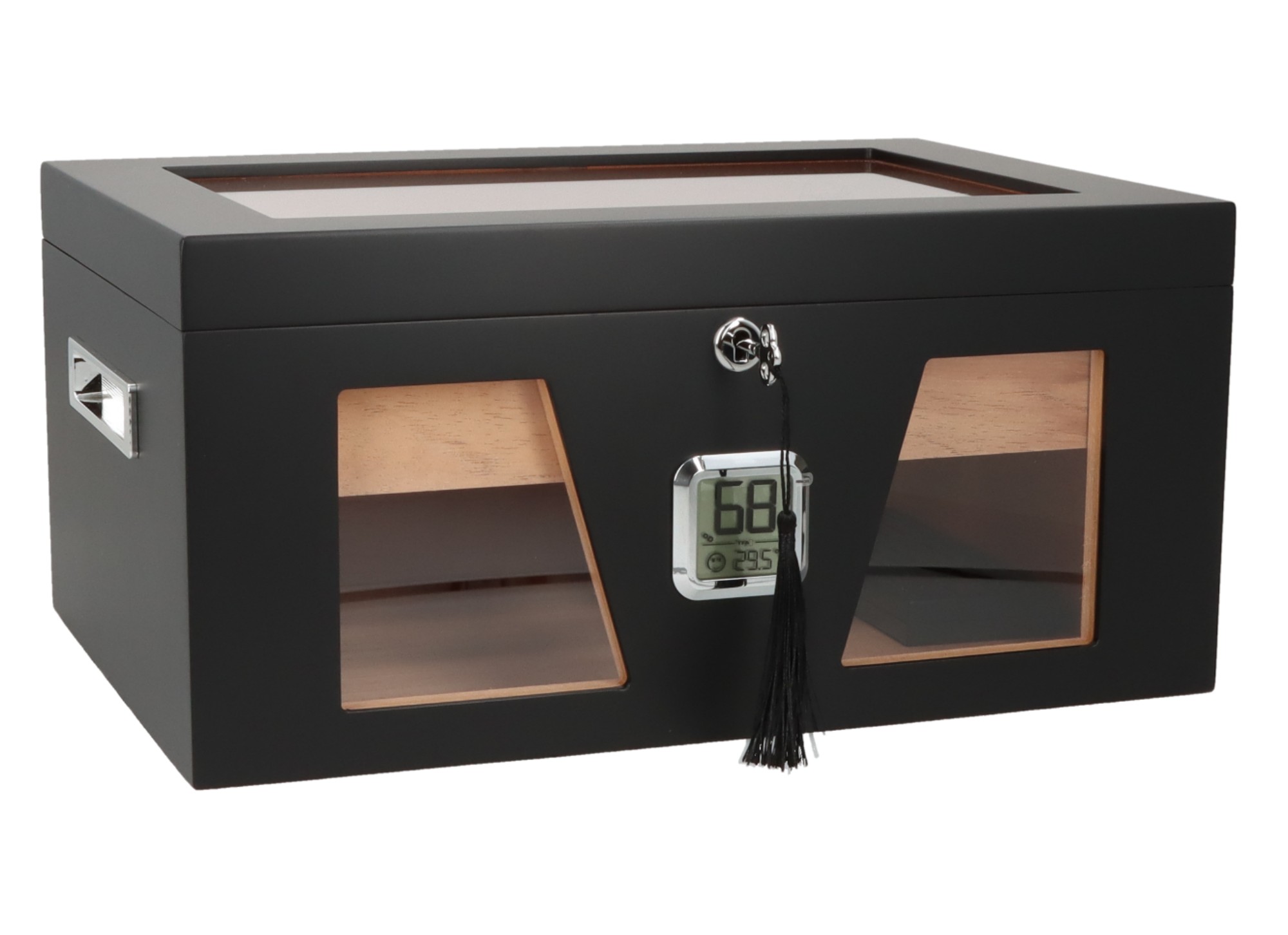 Der exklusive Markenhumidor mit Holz-Dekor für ca. 100-130 Zigarren (je nach Format) ist ein sehr schöner Humidor mit 3 Sichtfenster, die eine freie Sicht auf Ihre Zigarren gewährleisten. Dieses Schmuckstück besitzt ein Sichtfenster aus Kristallglas im Deckel und 2 weitere Sichtfenster aus Acrylglas. Innen ist der Humidor komplett mit spanischem Zedernholz ausgekleidet, hat ein herausnehmbaren Tablett aus spanischem Zedernholz und hat zwei Divider (variables Trennholz). Der Humidor hat außerdem sauber eingelassene, robuste verchromte Quadrant-Scharniere, ein Schloss mit zwei Schlüssel und einem von außen ablesbarem Digital-Hygrometer..- für ca. 100 - 130 Zigarren (je nach Format)