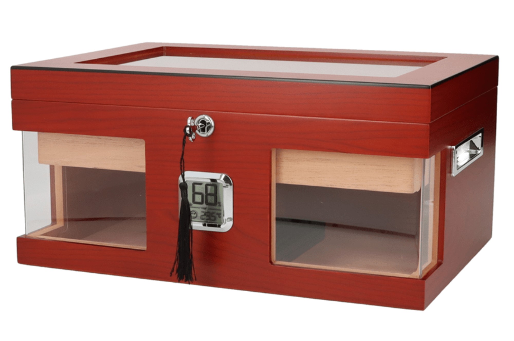 Der exklusive Markenhumidor in rotbrauner Holzoptik für ca. 100-150 Zigarren (je nach Format) ist ein sehr schöner Humidor mit 3 Sichtfenster, die eine freie Sicht auf Ihre Zigarren gewährleisten. Dieses Schmuckstück besitzt ein Sichtfenster aus Kristallglas im Deckel und 2 weitere Sichtfenster aus Acrylglas. Innen ist der Humidor komplett mit spanischem Zedernholz ausgekleidet, hat ein herausnehmbaren Tablett aus spanischem Zedernholz und besitzt zwei Divider (variables Trennholz). Der Humidor hat außerdem sauber eingelassene, robuste verchromte Quadrant-Scharniere, ein Schloss mit zwei Schlüssel und einem von außen ablesbarem Digital-Hygrometer.- für ca. 100 - 150 Zigarren (je nach Format)