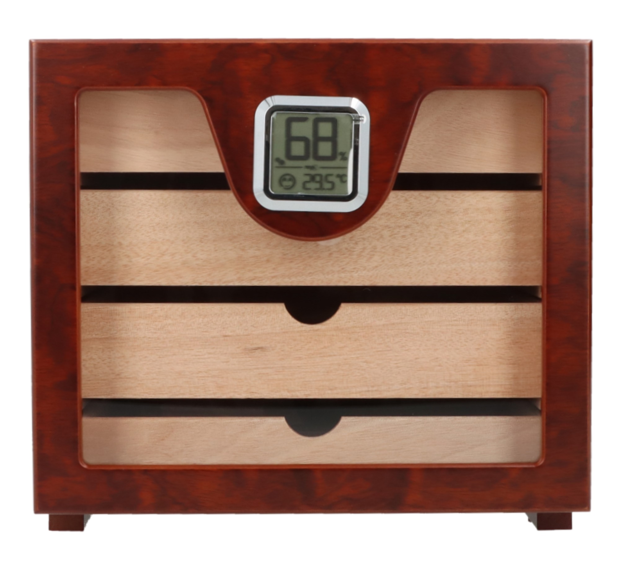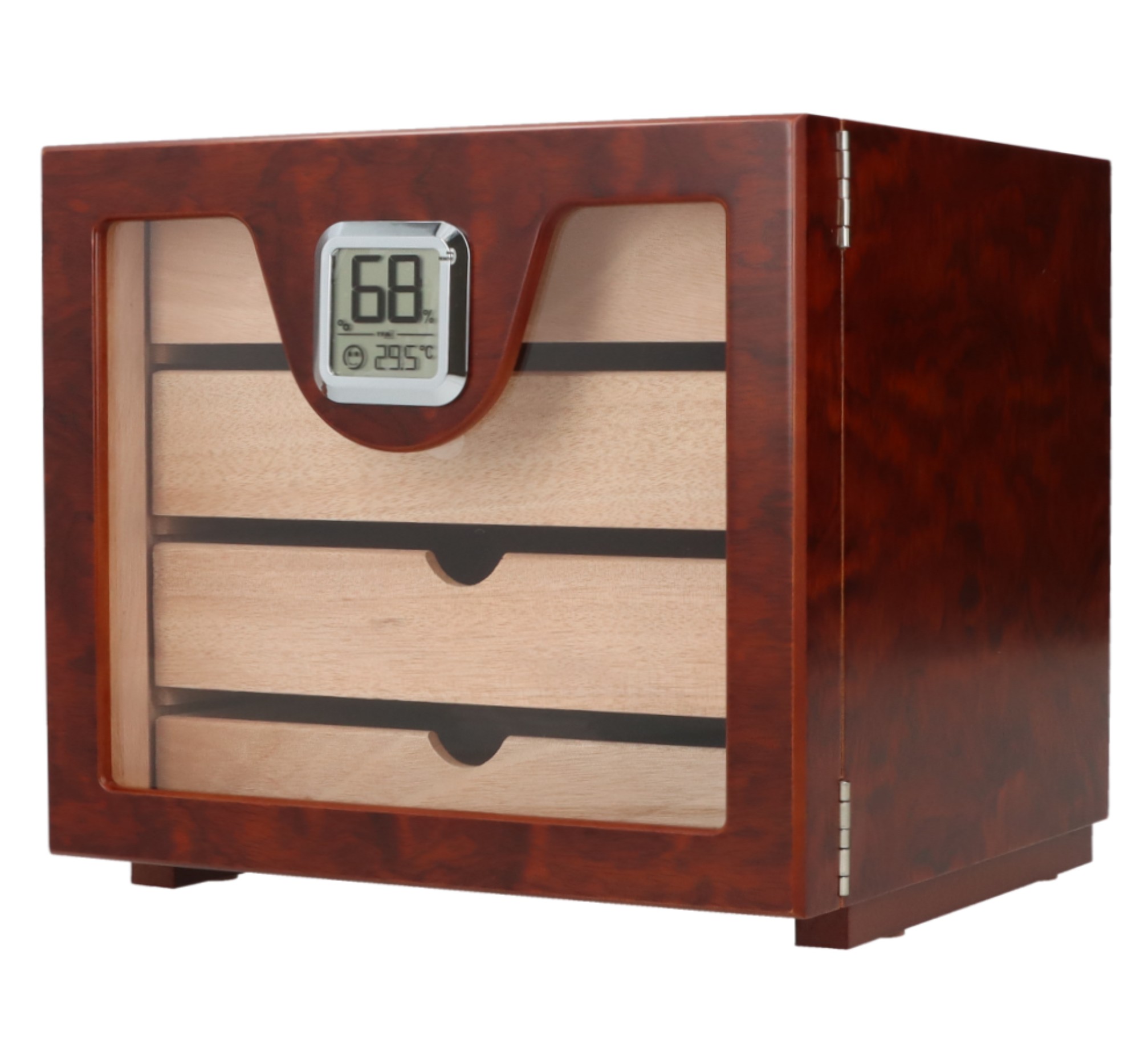 Der Marken-Humidor Angelo Wurzelholz-Design für ca. 55-65 Zigarren (je nach Format) ist ein in Handarbeit hergestellter, dekorativer und klassischer Humidorschrank. Sein außergewöhnliches Design in Wurzelholz ist bei Zigarrenliebhaber immer sehr beliebt. Außerdem besitzt er abgerundete Ecken und ein Außen-Digitalhygrometer (Luftfeuchtigkeitsmesser). Dieser Humidorschrank besticht durch für seine Preisklasse hervorragende Verarbeitung mit einer hochwertige Sandwichbauweise und der Verwendung von bewährten, hochwertigen Materialien. Mit diesem Humidor hohlen Sie sich ein wenig Zigarrenflair ins Wohnzimmer, Büro oder in Ihre Bar.Die Größe eignet sich für mittelgroße Zigarrensammlungen oder auch als Zweithumidor. Der Humidorschrank hat 4 Schubladen, die untere Schublade ist für den Befeuchter vorgesehen.
