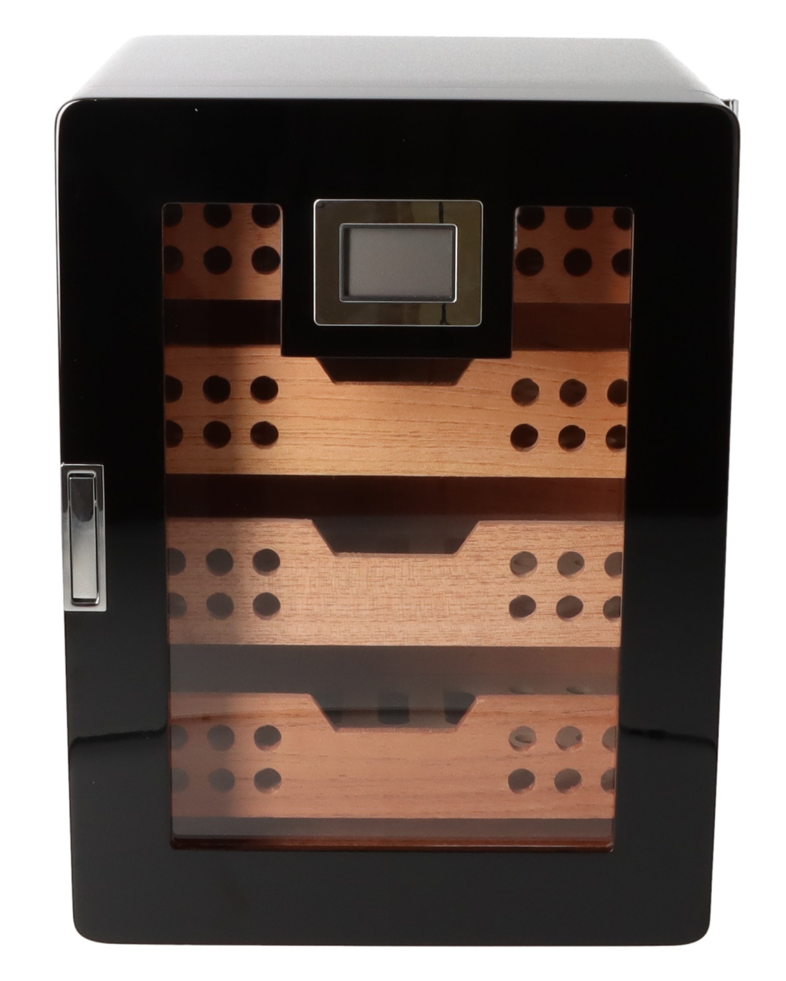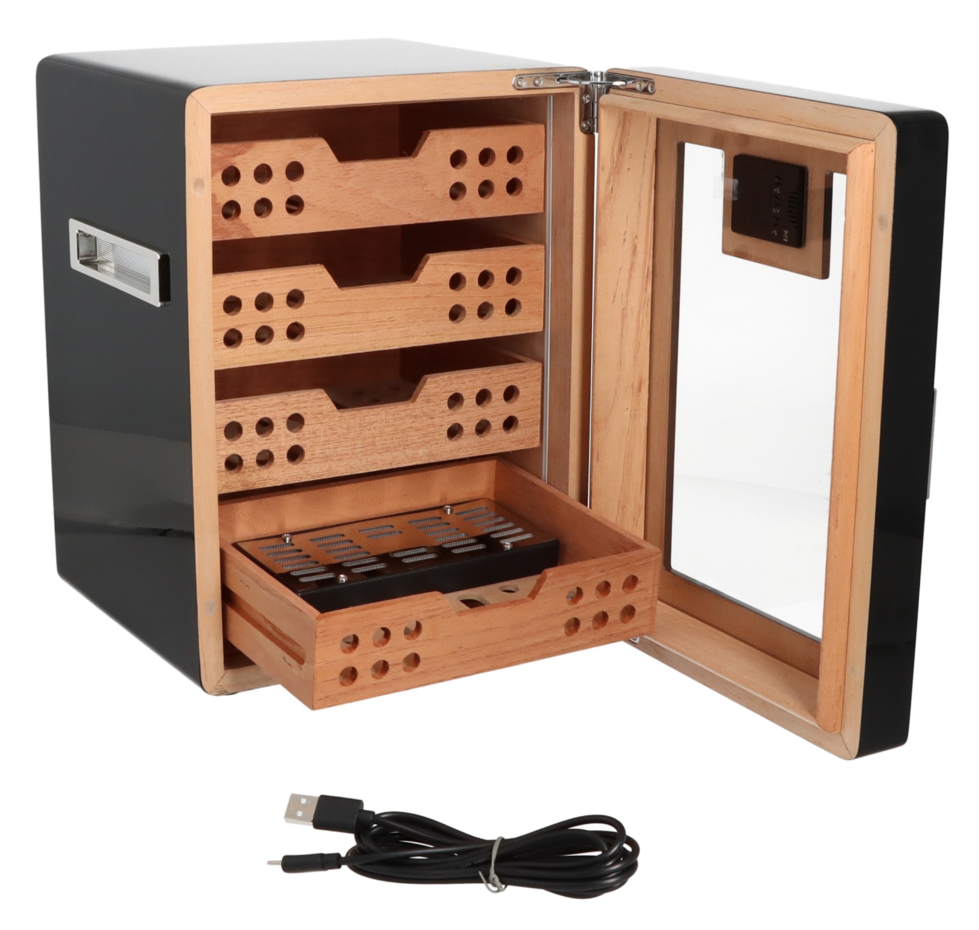 Dieser Humidorschrank besticht durch für seine Preisklasse hervorragende Verarbeitung mit einer hochwertige Sandwichbauweise und der Verwendung von bewährten, hochwertigen Materialien. Mit diesem Humidor hohlen Sie sich ein wenig Zigarrenflair ins Wohnzimmer, Büro oder in Ihre Bar. Die Größe eignet sich für mittelgroße Zigarrensammlungen oder auch als Zweithumidor. Der Humidorschrank hat 4 Schubladen, die untere Schublade ist auch für den Befeuchter vorgesehen. Innen ist der Humidor mit spanischem Zedernholz ausgekleidet. Die Schubladen sind so konstruiert, dass die Luft im inneren zirkulieren kann, wodurch die Luftfeuchtigkeit gleichmäßiger verteilt wird. Der Humidor hat außerdem sauber eingelassene, robuste silberne Quadrant-Scharniere. Die Türe wird durch einen Magnetverschluß zugehalten und besitzt einen silbernen Griff, der das Öffnen erleichtert. Das Innere des Humidors wird dezent mit LED's beleuchtet. An beiden Seiten sind je ein silberner Griff angebracht. Der kleine Schrankhumidor verbindet modernes Design und den günstigen Preis.