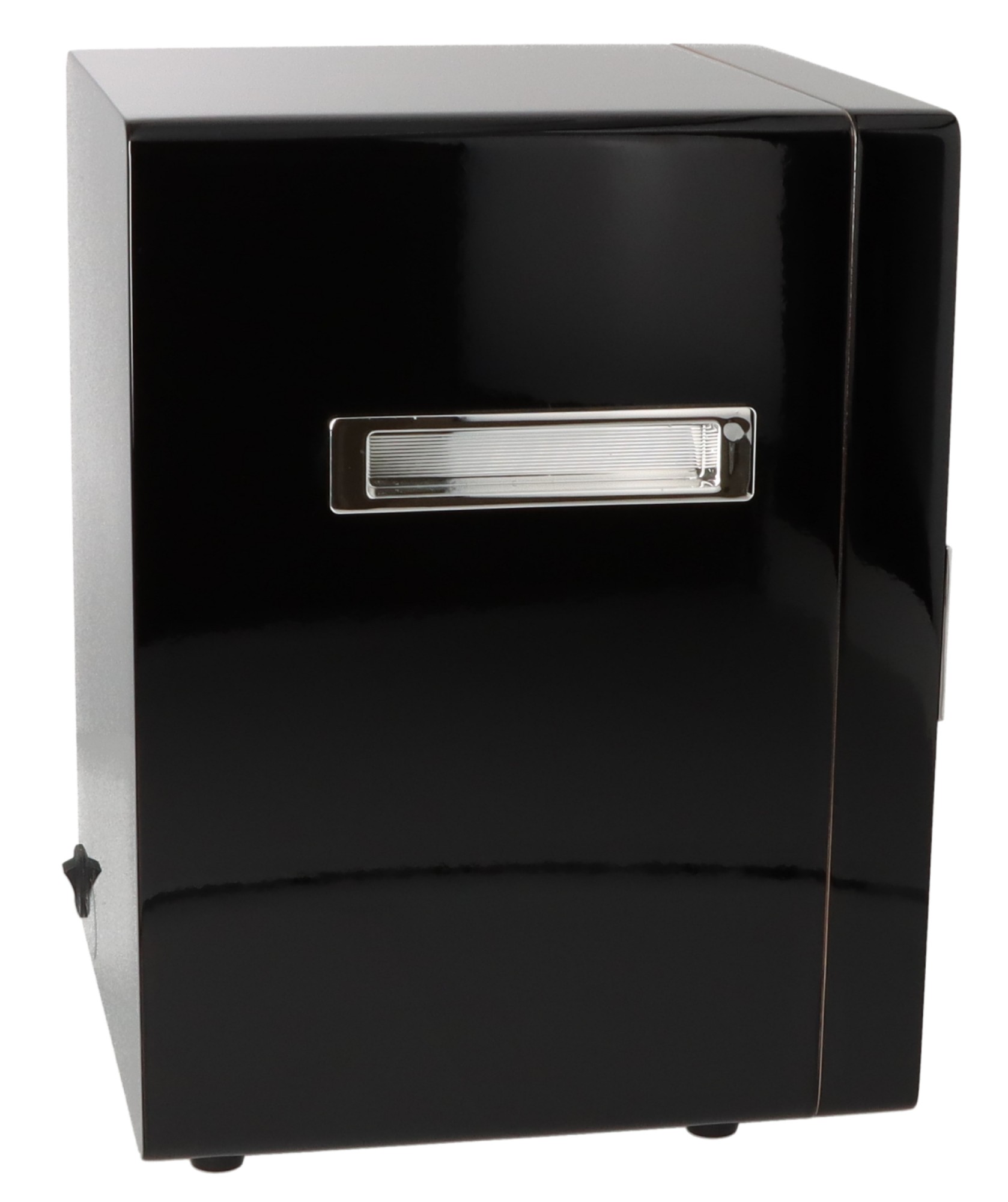 Der Marken-Humidor Angelo LED schwarz matt für ca. 55-80 Zigarren (je nach Format) ist ein in Handarbeit hergestellter, dekorativer moderner Humidorschrank mit LED Beleuchtung.Sein außergewöhnliches Design in der Farbe schwarz matt ist bei Zigarrenliebhaber immer sehr beliebt. Außerdem besitzt er abgerundete Ecken und ein Digital-Außenhygrometer (Luftfeuchtigkeitsmesser) .