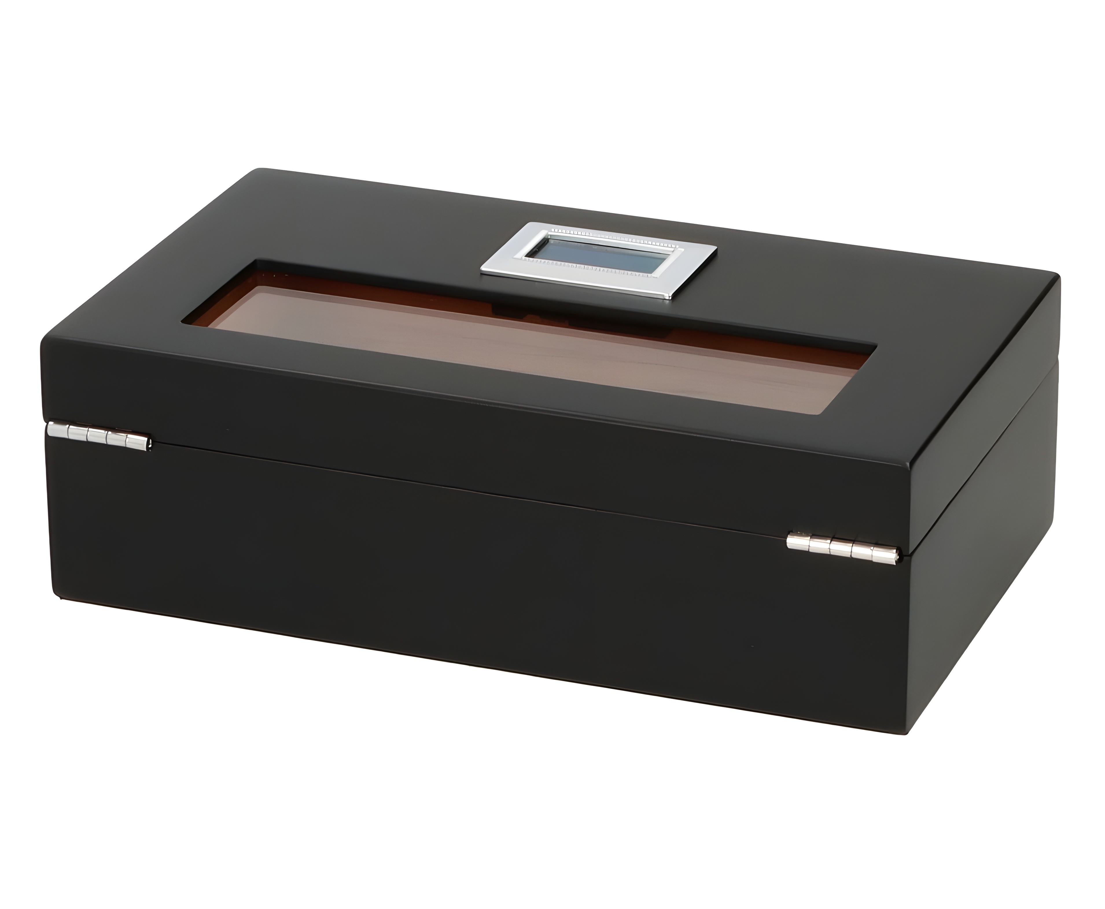 Der Marken-Humidor Angelo schwarz matt mit halbgroßem Kristallglasfenster und Digitalhygrometer im Deckel für ca. 10-25 Zigarren (je nach Format) ist ein in Handarbeit hergestellter, dekorativer und klassischer Humidor. Sein außergewöhnliches Design ist bei Zigarrenliebhaber immer sehr beliebt. Außerdem besitzt er abgerundete Ecken und ein Digital-Außenhygrometer (Luftfeuchtigkeitsmesser) im Deckel. Dieser Humidor besticht durch eine sehr gute Verarbeitung mit einer hochwertigen Sandwichbauweise und die Verwendung von bewährten, hochwertigen Materialien. Mit diesem Humidor hohlen Sie sich ein wenig Zigarrenflair ins Wohnzimmer, Büro oder in Ihre Bar. Wegen dem Sichtfenster sollte der Humidor nicht der direkten Sonnenstrahlung ausgesetzt sein. Die Größe eignet sich für kleinere Zigarrensammlungen oder auch als Zweithumidor. Innen ist der Humidor mit spanischem Zedernholz ausgekleidet. Der Humidor hat außerdem sauber eingelassene, robuste silberne Quadrant-Scharniere.- Angelo Markenhumidor