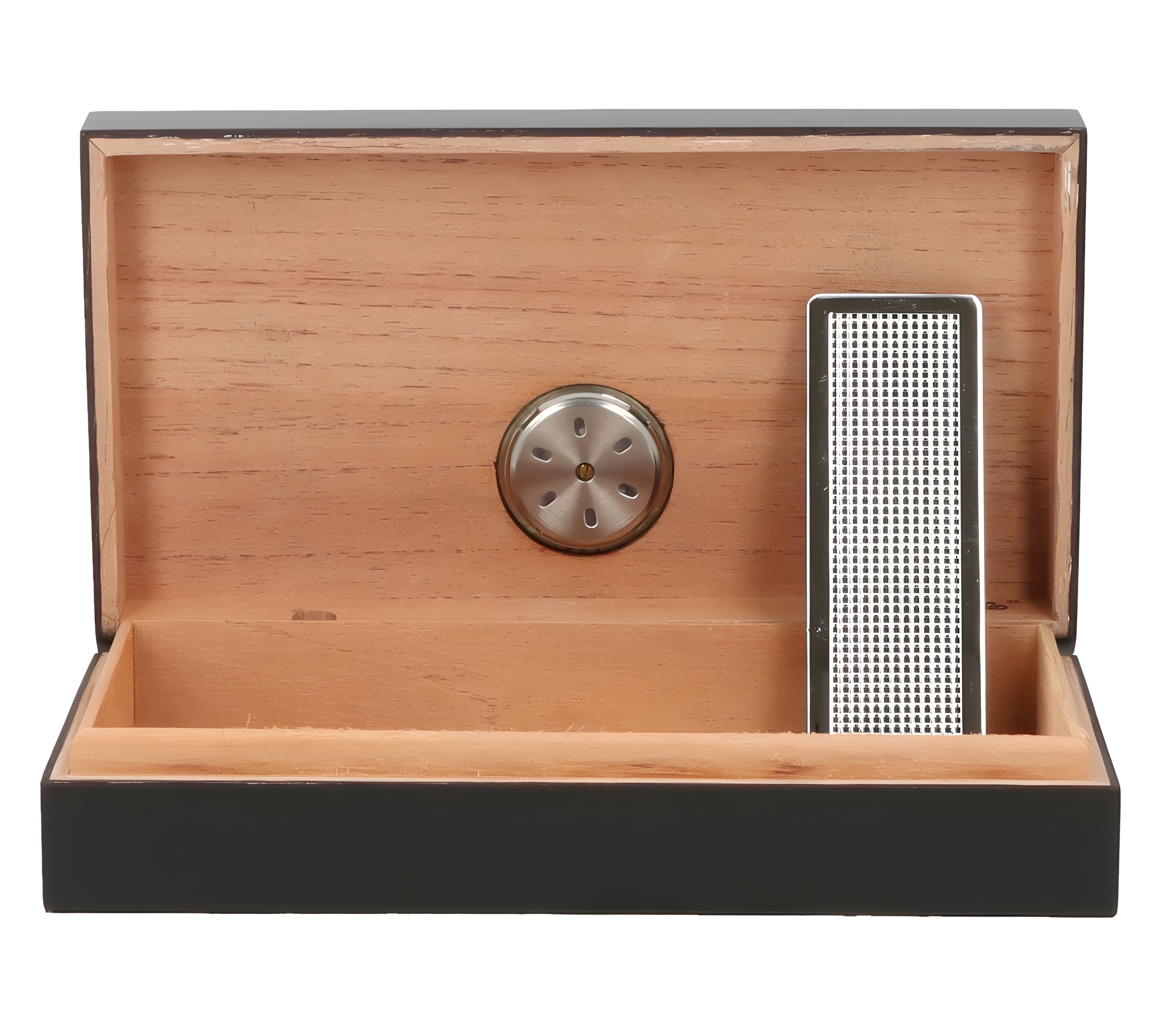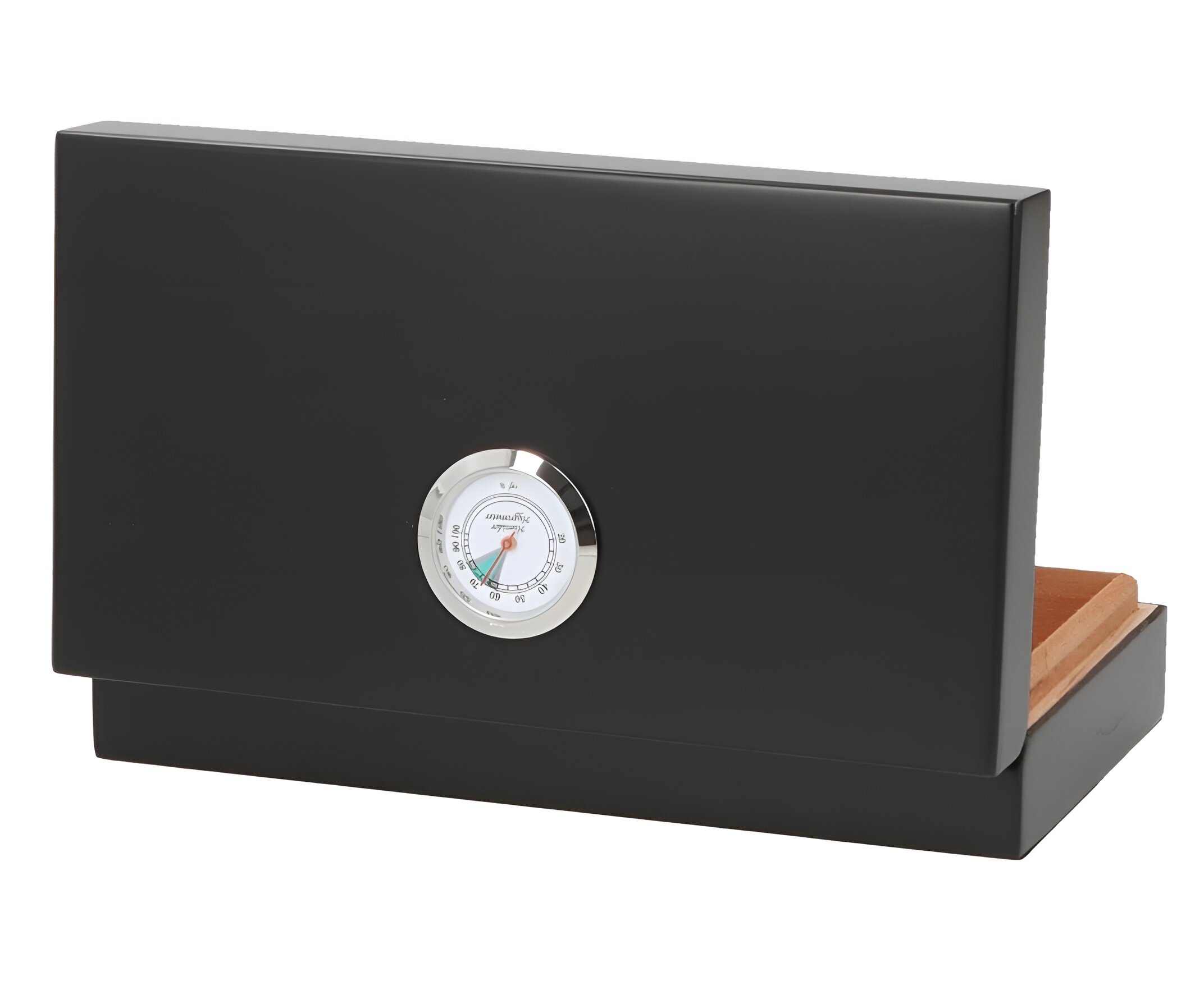 Der Marken-Humidor Angelo schwarz matt mit Hygrometer im Deckel für ca. 5-10 Zigarren (je nach Format) ist ein in Handarbeit hergestellter, dekorativer und klassischer Humidor. Sein außergewöhnliches Design ist bei Zigarrenliebhaber immer sehr beliebt. Außerdem besitzt er abgerundete Ecken und ein Außenhygrometer (Luftfeuchtigkeitsmesser) im Deckel. Dieser Humidor besticht durch eine sehr gute Verarbeitung mit einer hochwertigen Sandwichbauweise und die Verwendung von bewährten, hochwertigen Materialien. Mit diesem Humidor hohlen Sie sich ein wenig Zigarrenflair ins Wohnzimmer, Büro oder in Ihre Bar. Wegen dem Sichtfenster sollte der Humidor nicht der direkten Sonnenstrahlung ausgesetzt sein. Die Größe eignet sich für kleine Zigarrensammlungen oder auch als Zweithumidor. Innen ist der Humidor mit spanischem Zedernholz ausgekleidet. Der Humidor ist auch als kleiner Reisehumidor oder als Humidor für die tasche geeignet.- Angelo Markenhumidor