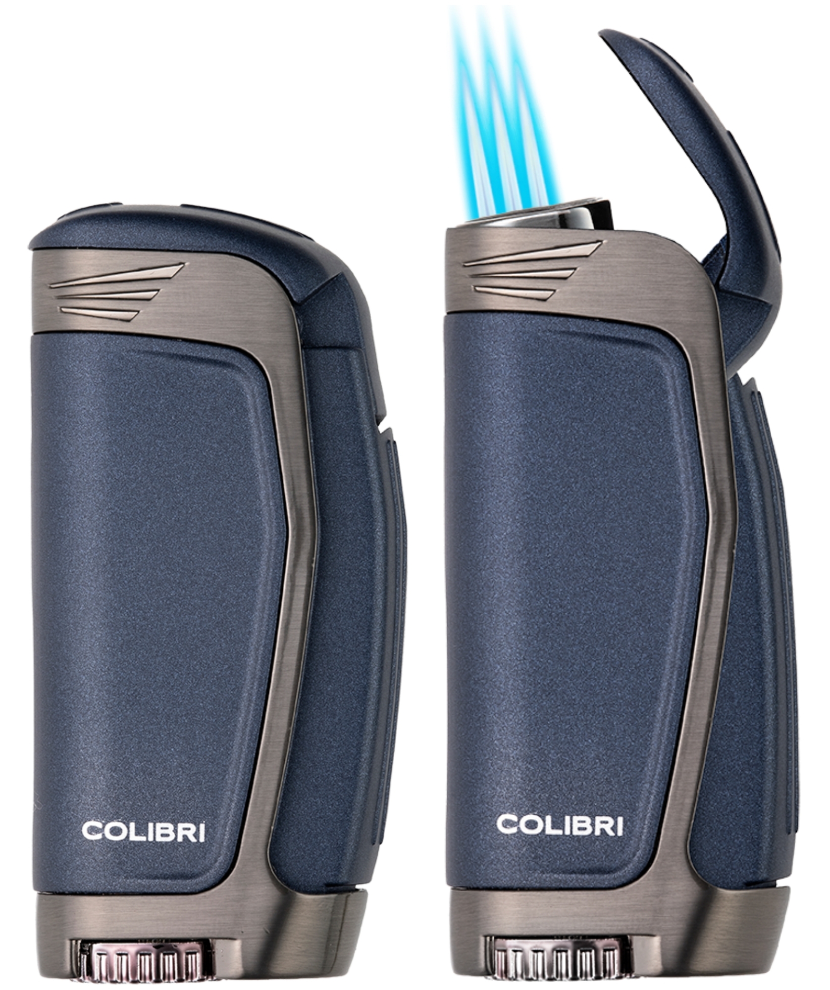 Colibri E3 blau gunmetal mit 3-fach Jet-Flamme offen - © raucher-xxl.de