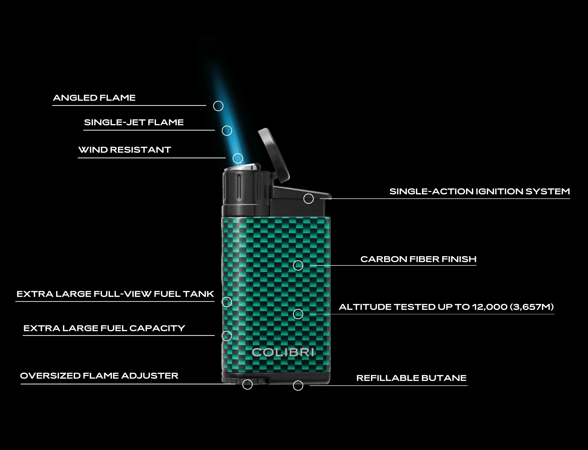 Colibri Evo Carbon Design grün / schwarz Feuerzeug mit 1-fach Laser-Jet-Flamme (Schrägflamme)