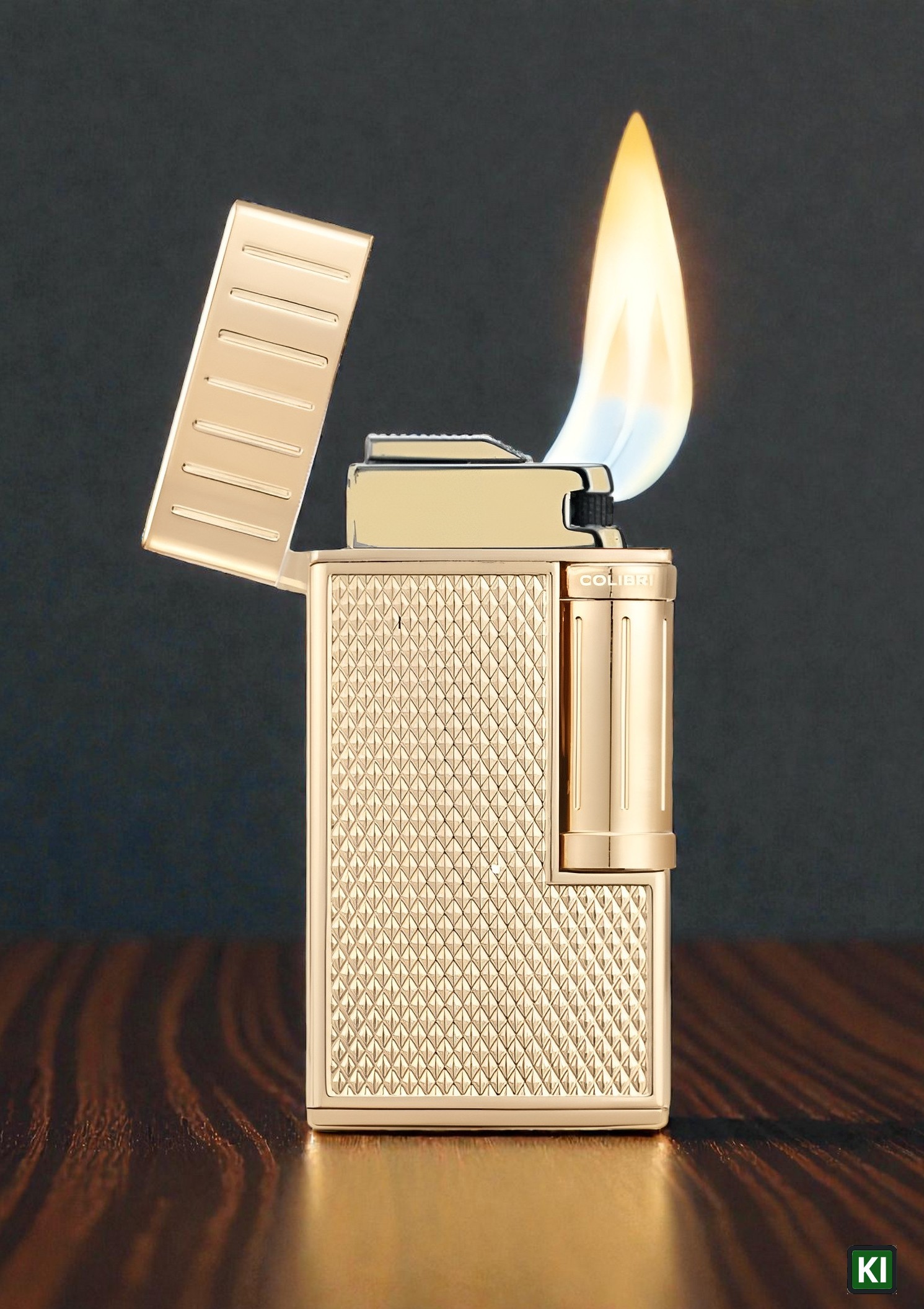 Das Design ist edel, extravagant eher klassisch zum Teil mit einem eleganten Rautenmuster. Die robuste abgewinkelte Doppelflamme wird mühelos mit dem großen Reibrad entzündet