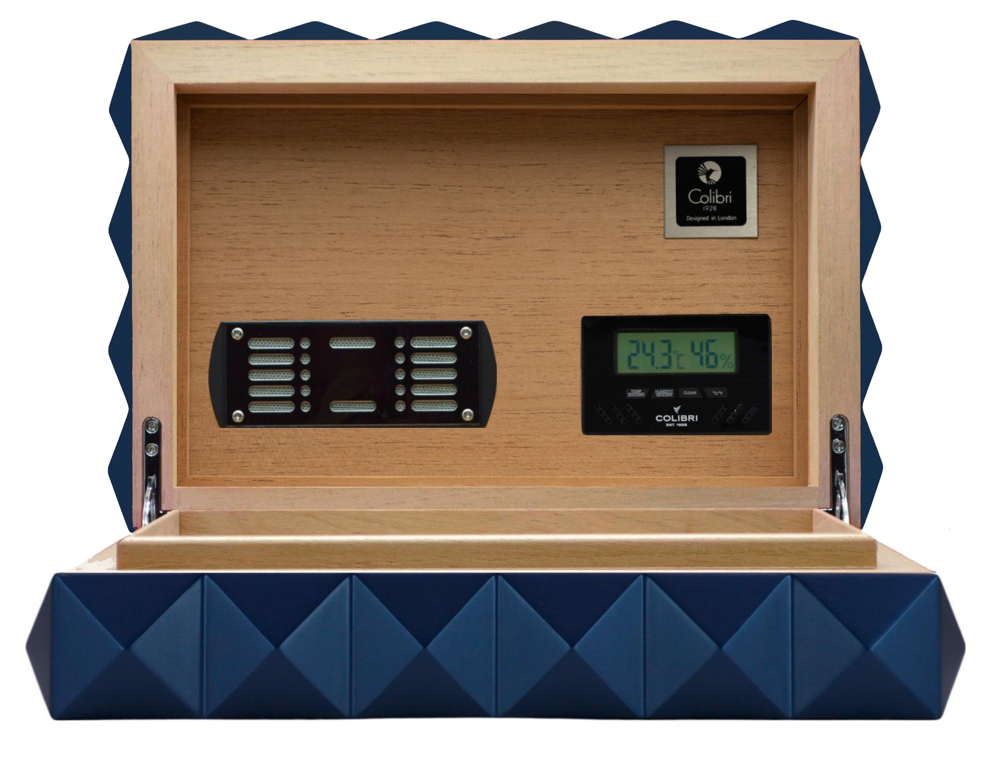Der blaue Colibri-Humidor verleiht seiner Umgebung durch sein einzigartiges, dreidimensionales Pyramiden-Kacheldesign einen futuristischen Touch. Der Humidor fasst bis zu 45 Cigarren, die dank der zwei flexiblen Trennleisten beliebig unterteilt werden können. Das Befeuchtungssystem besteht aus einem Humidifer (Polymerbefeuchter) und einem Digitalhygrometer. Beide sind magnetisch und können flexibel an der Innenseite des Deckels angebracht werden. Der Deckel schließt vollkommen luftdicht ab, so bleiben Ihre Cigarren perfekt verwahrt.