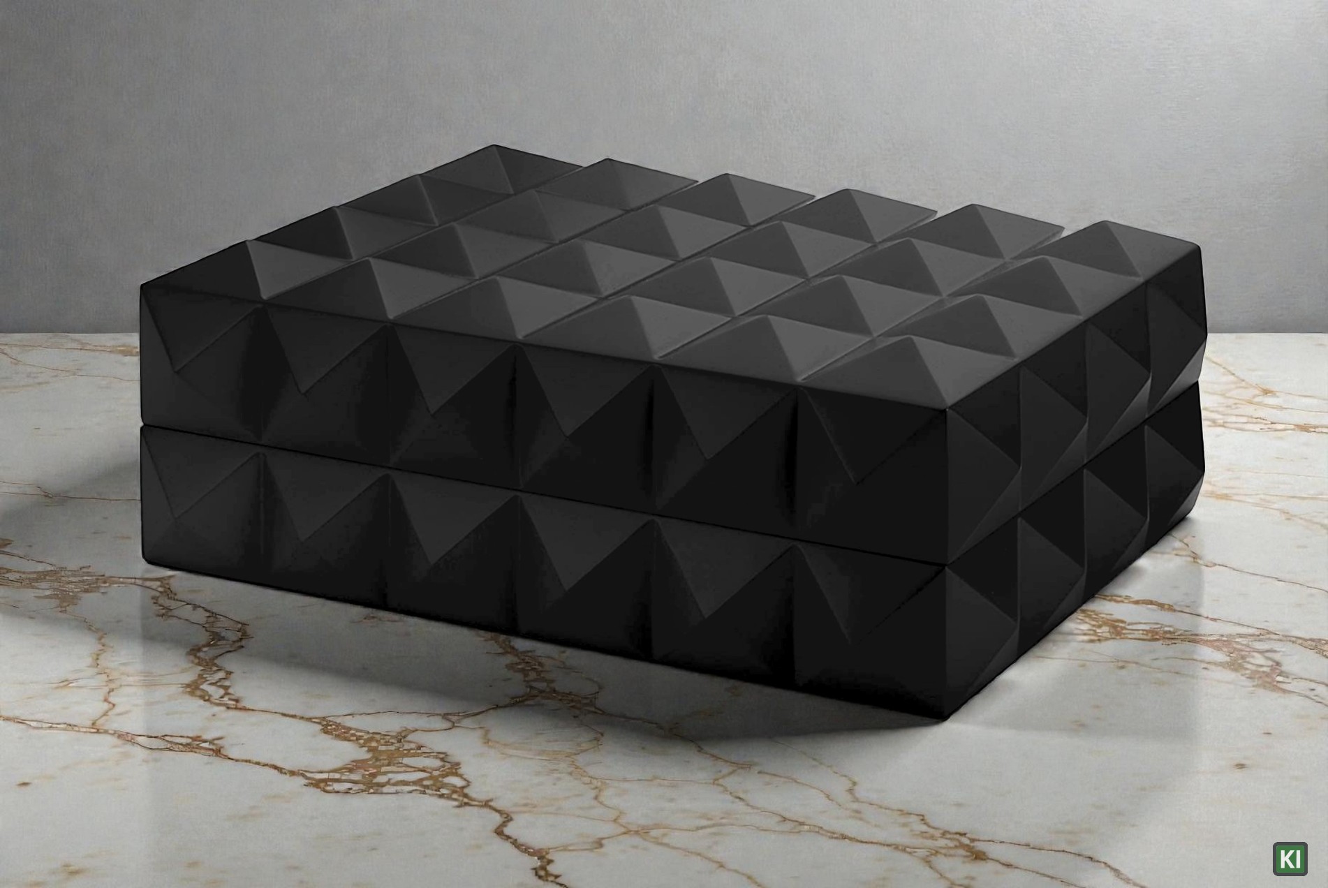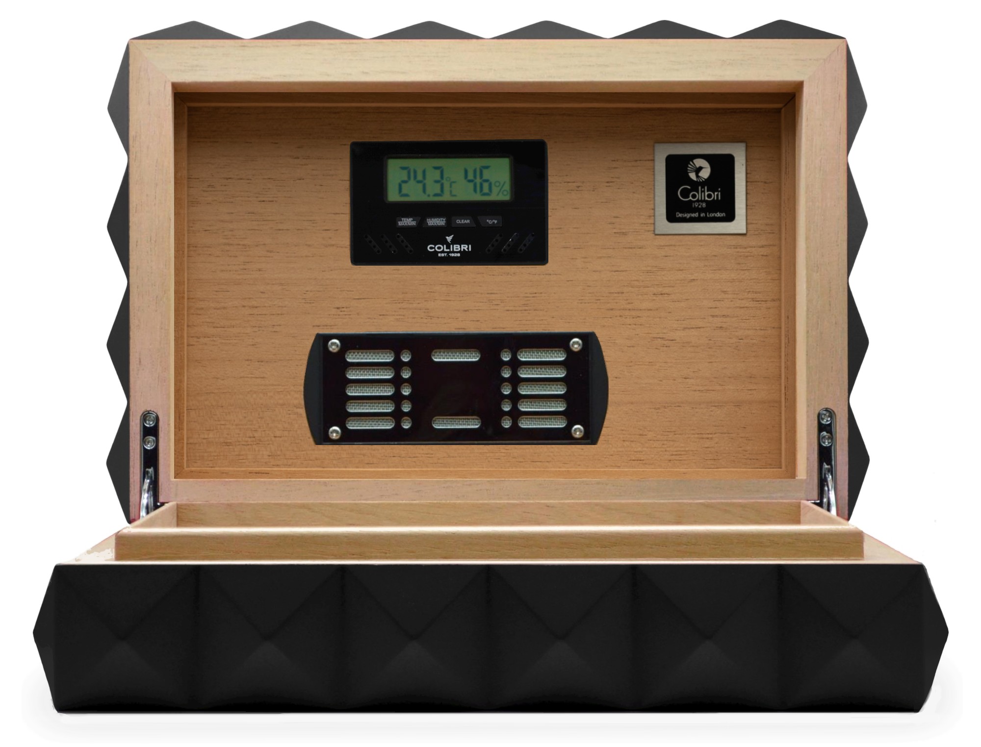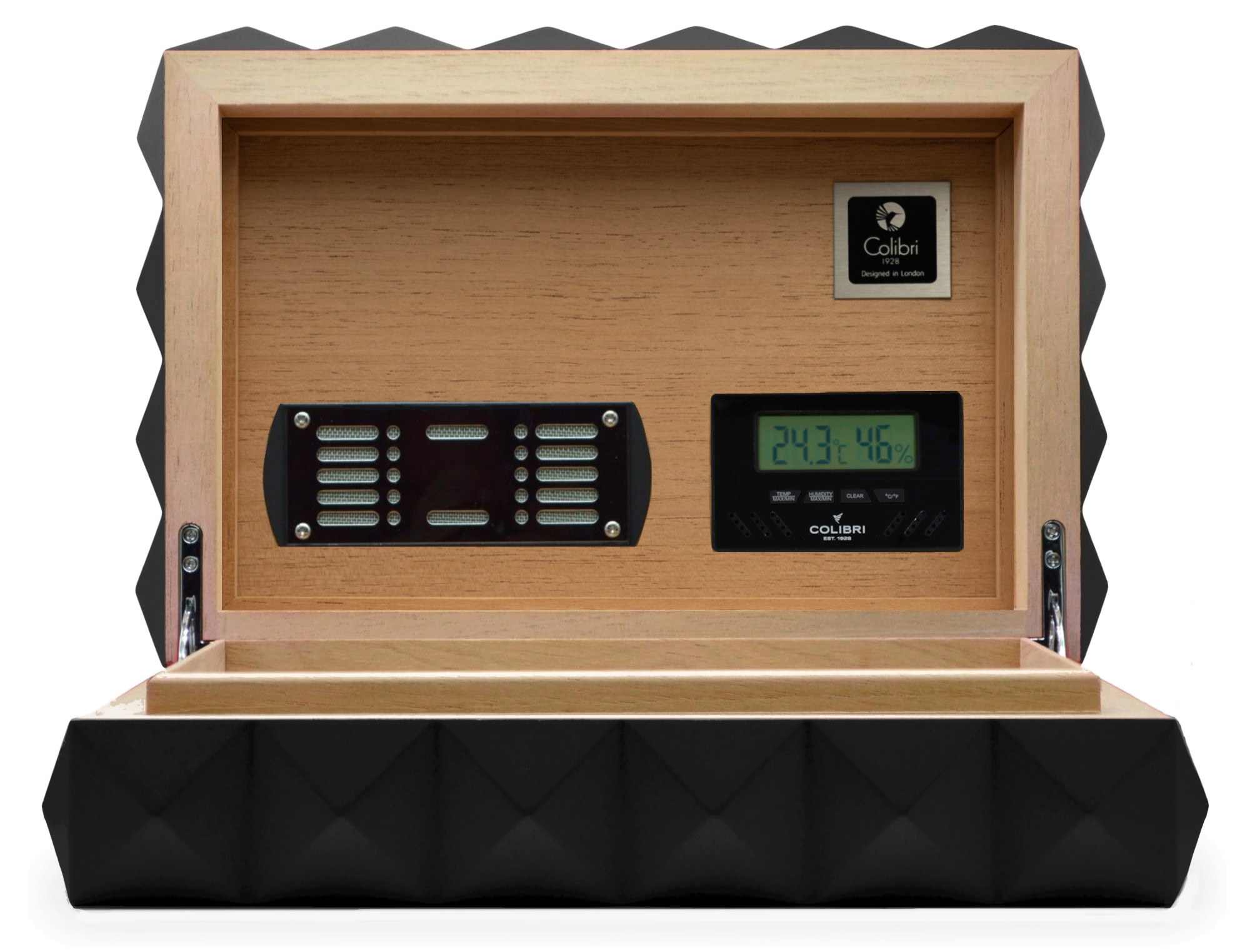 Der schwarze Colibri-Humidor verleiht seiner Umgebung durch sein einzigartiges, dreidimensionales Pyramiden-Kacheldesign einen futuristischen Touch. Der Humidor fasst bis zu 45 Cigarren, die dank der zwei flexiblen Trennleisten beliebig unterteilt werden können. Das Befeuchtungssystem besteht aus einem Humidifer (Polymerbefeuchter) und einem Digitalhygrometer. Beide sind magnetisch und können flexibel an der Innenseite des Deckels angebracht werden. Der Deckel schließt vollkommen luftdicht ab, so bleiben Ihre Cigarren perfekt verwahrt.
