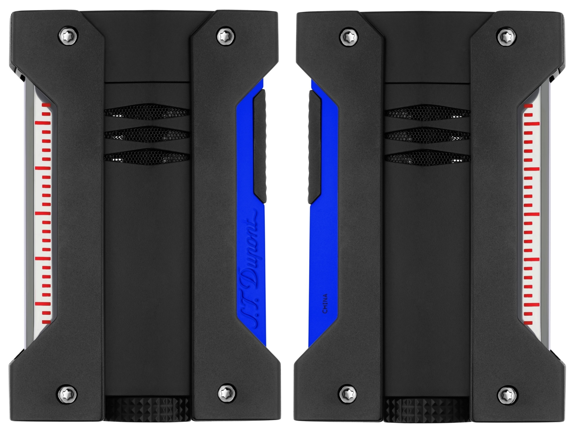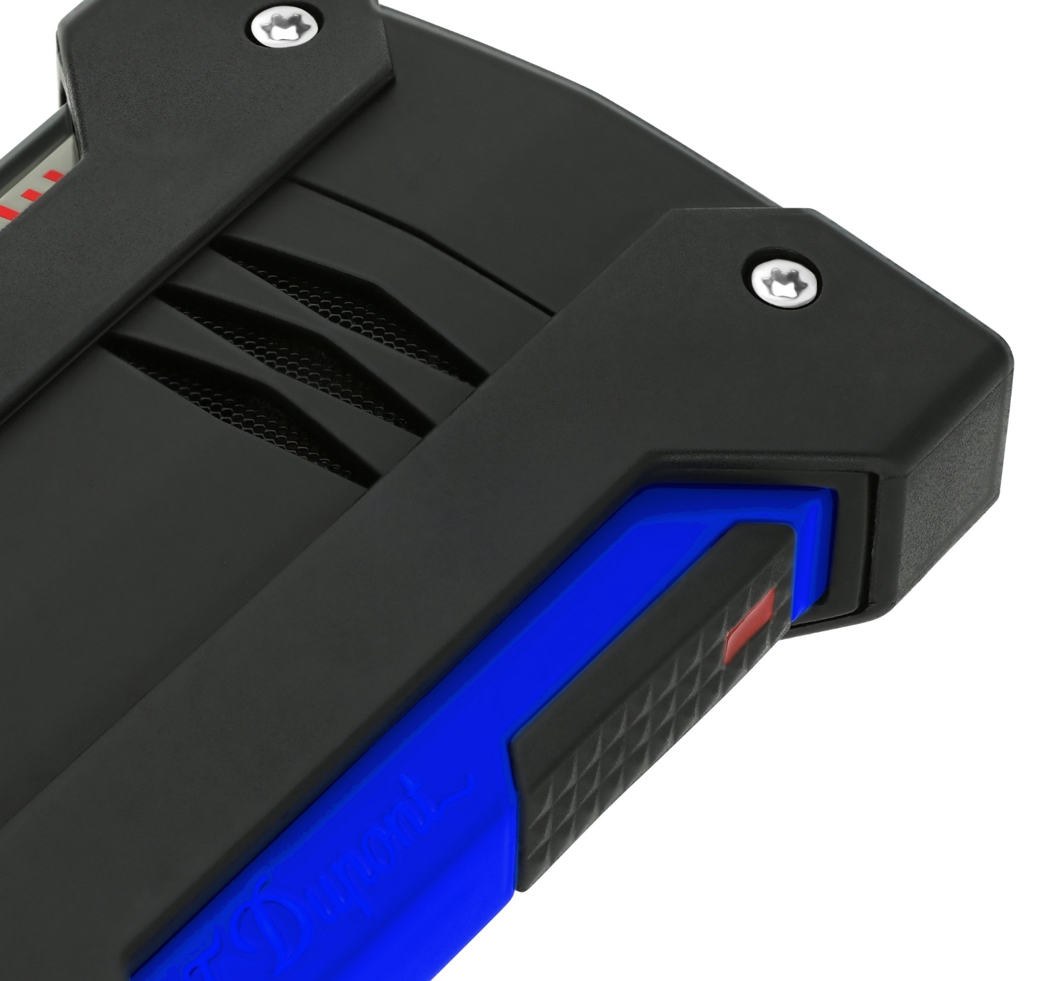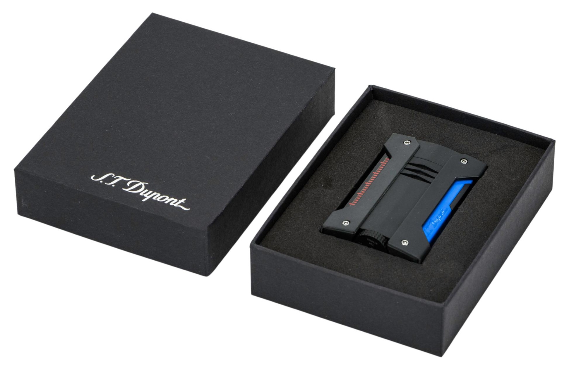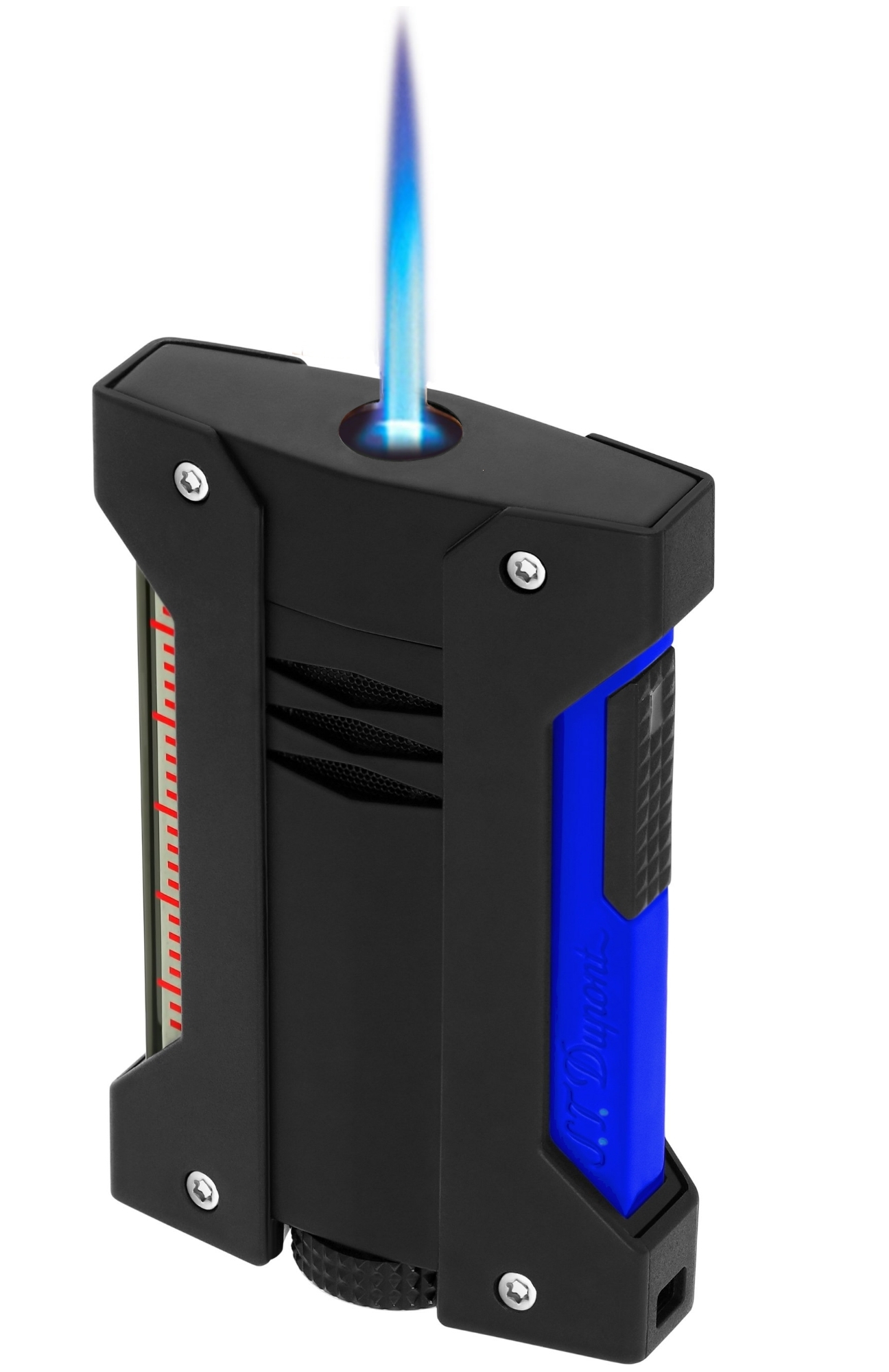 Modernes Outdoor-Markenfeuerzeug von S.T. Dupont in schwarz matt mit moderner blauen Zündtaste und mit kräftiger, windstabiler Flamme.Das Feuerzeug besitzt einem Metallkörper und ist durch eine elastische, schwarze Außenhülle gegen Erschütterungen geschützt. Mit dem speziell entwickelten Gas Defi Extreme (22% Propan, 54% Butan, 22% Iso-Butan) ist das Feuerzeug auch bei Temperaturen von -10°C bis +45°C und bis zu einer Höhe von 3500m ü. NN voll funktionsfähig. Unter normalen Bedingungen kann das Feuerzeug auch mit herkömmlichem, gereinigtem Gas befüllt werden.