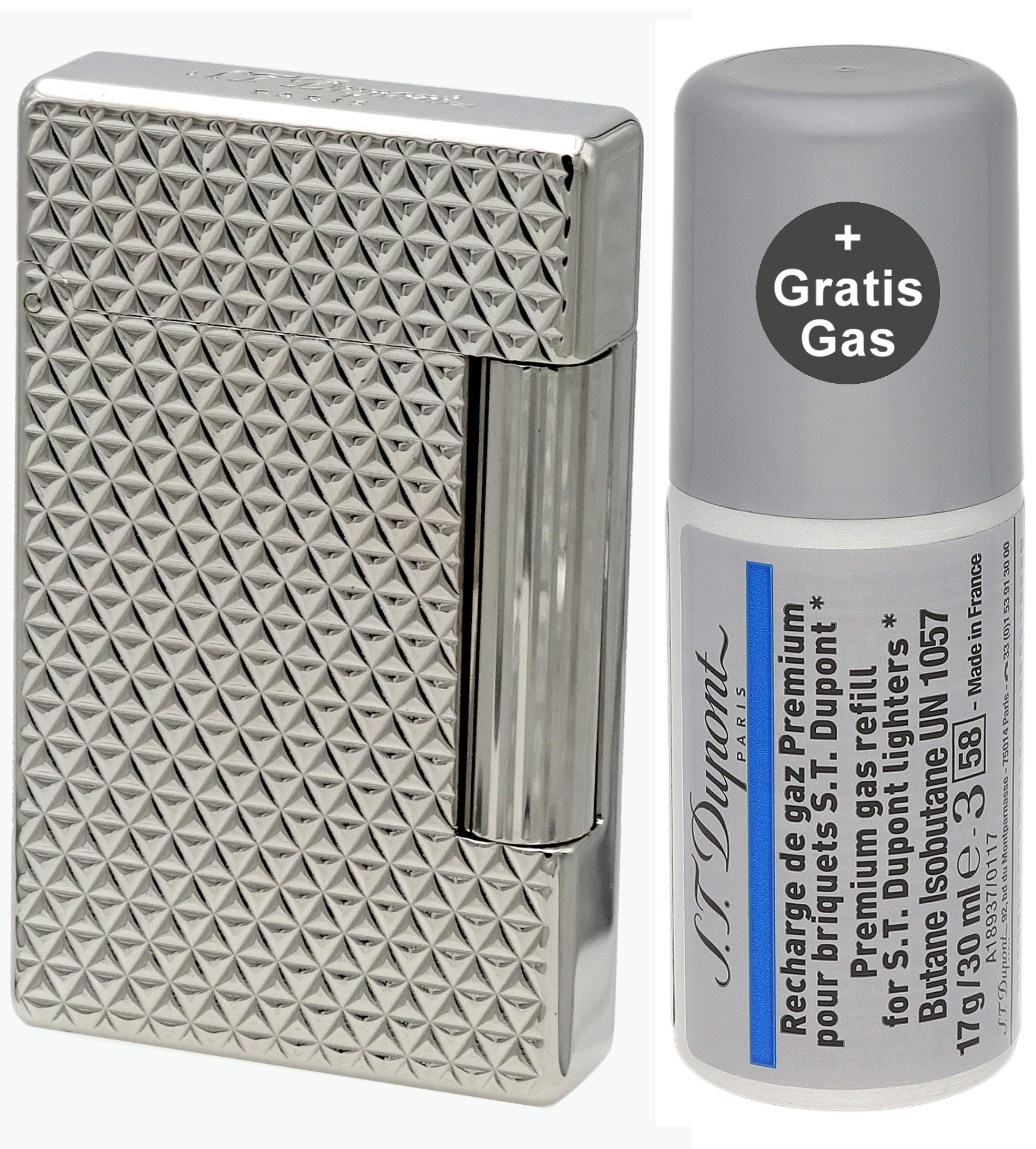 - Gratis-Zugabe: 1 x Dose Feuerzeuggas S.T. Dupont Dose 900434 (silber mit blauem Balken)