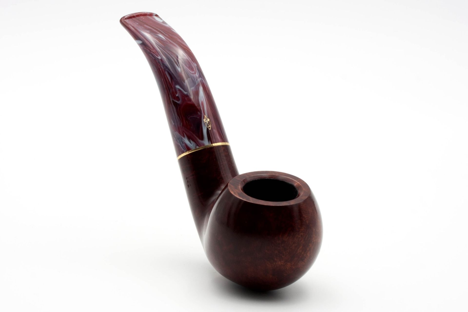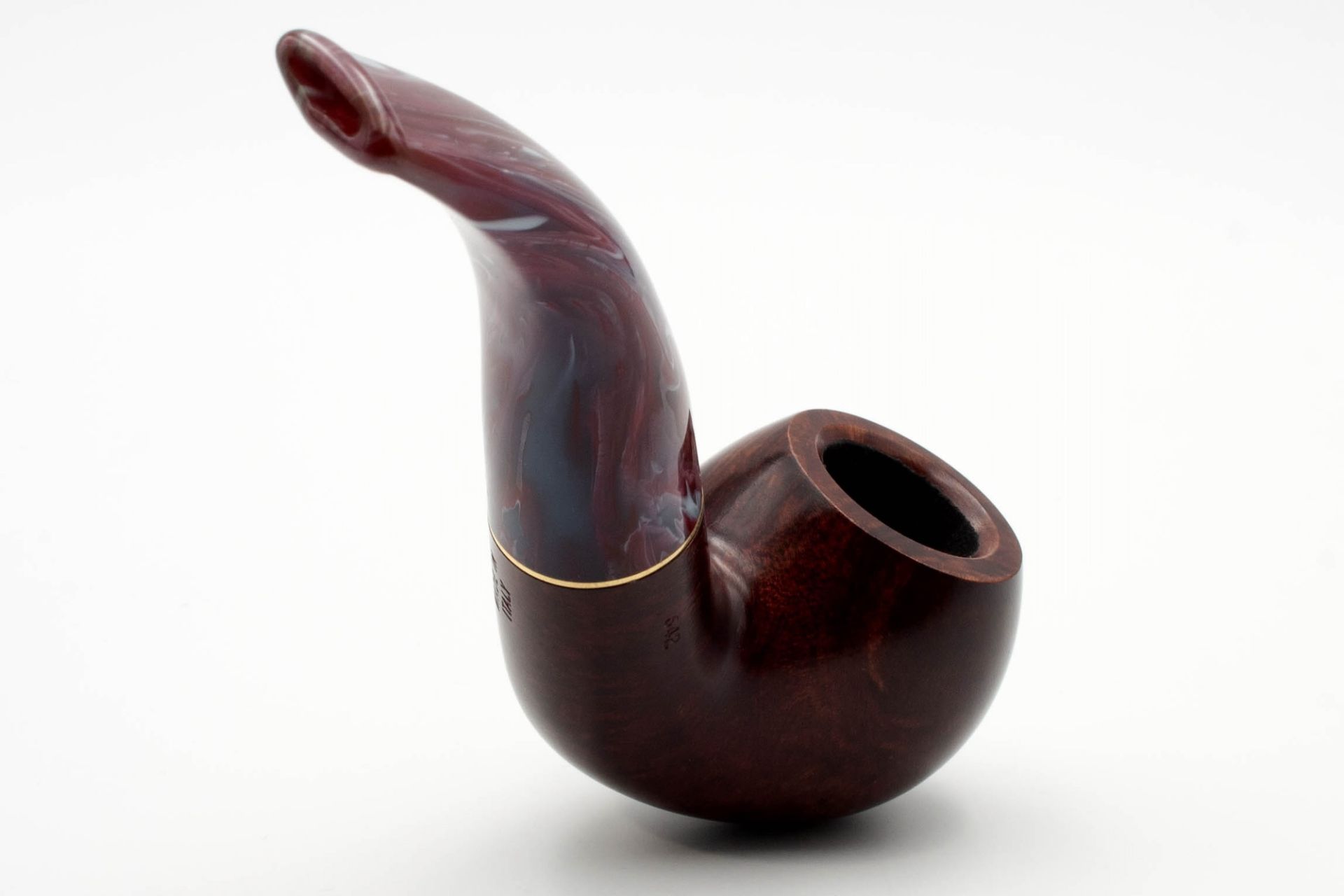 Das extravagante Mundstück mit den vielen Weinfarben prägt diese Pfeife zusammen mit dem Bordeaux-roten Pfeifenkopf. Im extra für Savinelli hergestellten Acryl-Mundstück finden sich Farbwirbel in roten und bläulichen Farbtönen wieder, für die italienischer Rotwein so bekannt sind. Im Herstellungsprozess des Mundstücks entstehen immer neue Farbkombinationen, keines gleicht dem anderen. Der Kopf ist bei dieser Pfeife Bordeaux-rot, glatt poliert und ist mit dem Pfeifenholm durch einen schmalen vergoldeten Messingring verbunden. Ein Savinelli-Highlight mit erstklassigem Preis-Leistungs-Verhältnis.