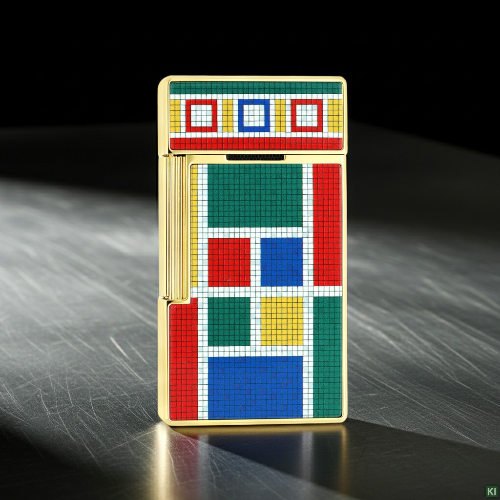 - Feuerzeug-Farbe: Körper und Drücker gold / Flächen bunt im Quadrat Muster