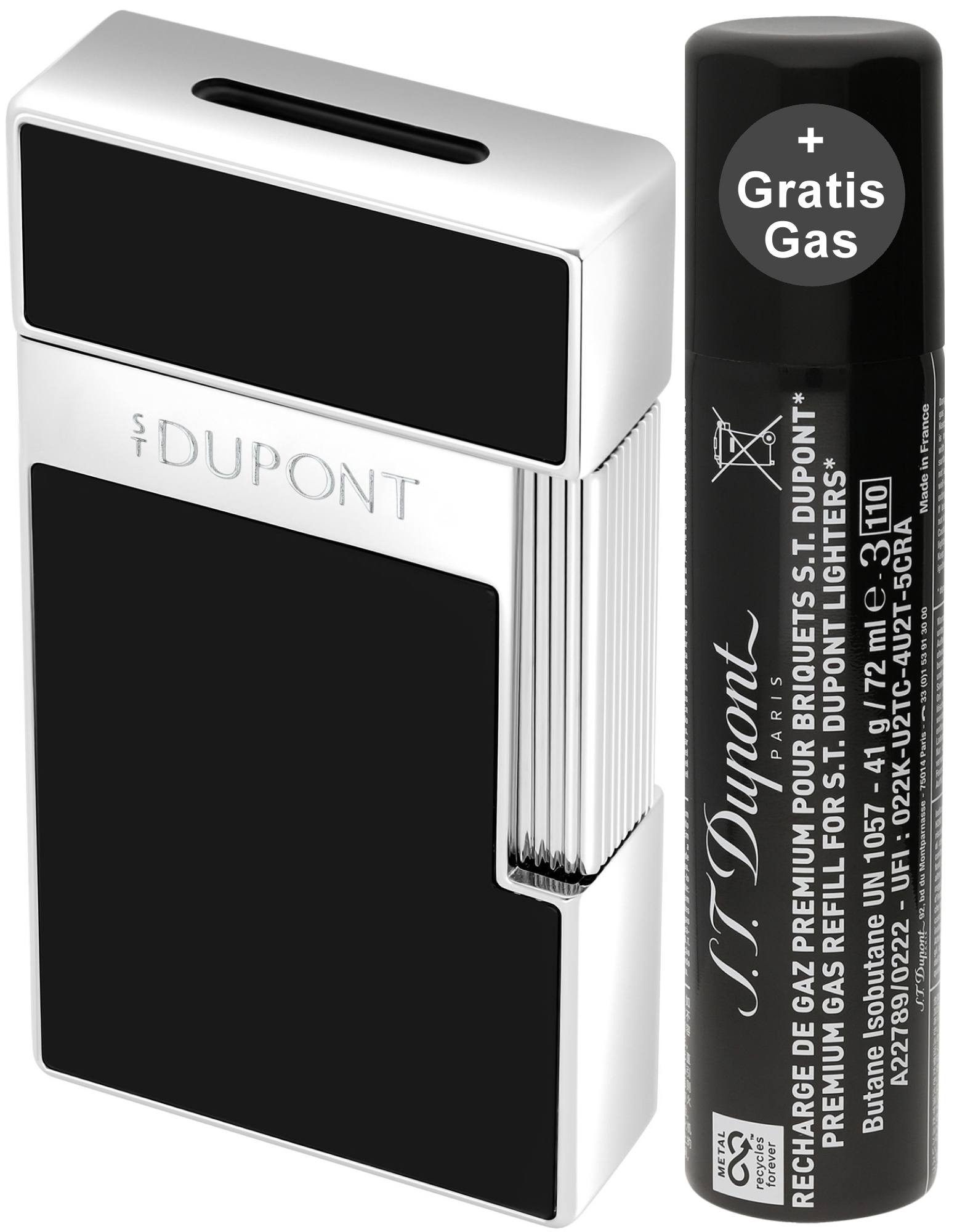 - Gratis-Zugabe: 1 x Dose Feuerzeuggas S.T. Dupont Dose 900430 (schwarz)