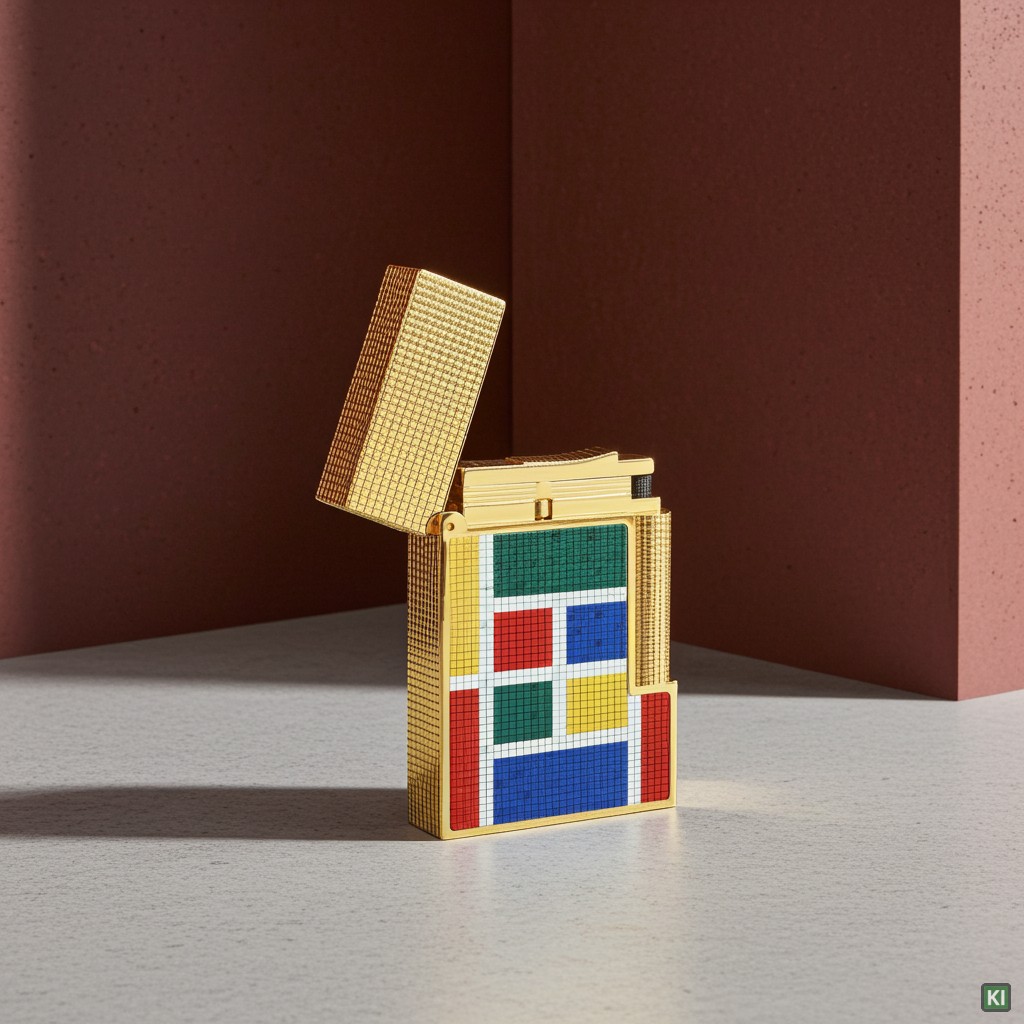 Dieses edle Feuerzeug wird mit vergoldetem Gehäuse und buntem Mosaic-Muster an Front- und Rückseite geliefert. Das ganze Feuerzeug ist mit einem neuen kleinen Quadratmuster verziert und besitzt einen Schriftzug S.T.Dupont Paris an der Front-Oberseite und einen Schriftzug "Casablanca" an der Rück-Oberseite des Feuerzeug-Deckels.