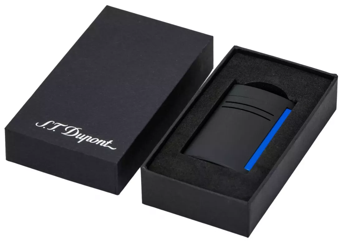 Das Feuerzeug wird mit einer passenden Dose S.T. Dupont Gas schwarz geliefert.Das MaxiJet Feuerzeug-Modell Fluo besitzt eine matt-schwarzes Gehäuse mit einem Zündtaster in blau.
