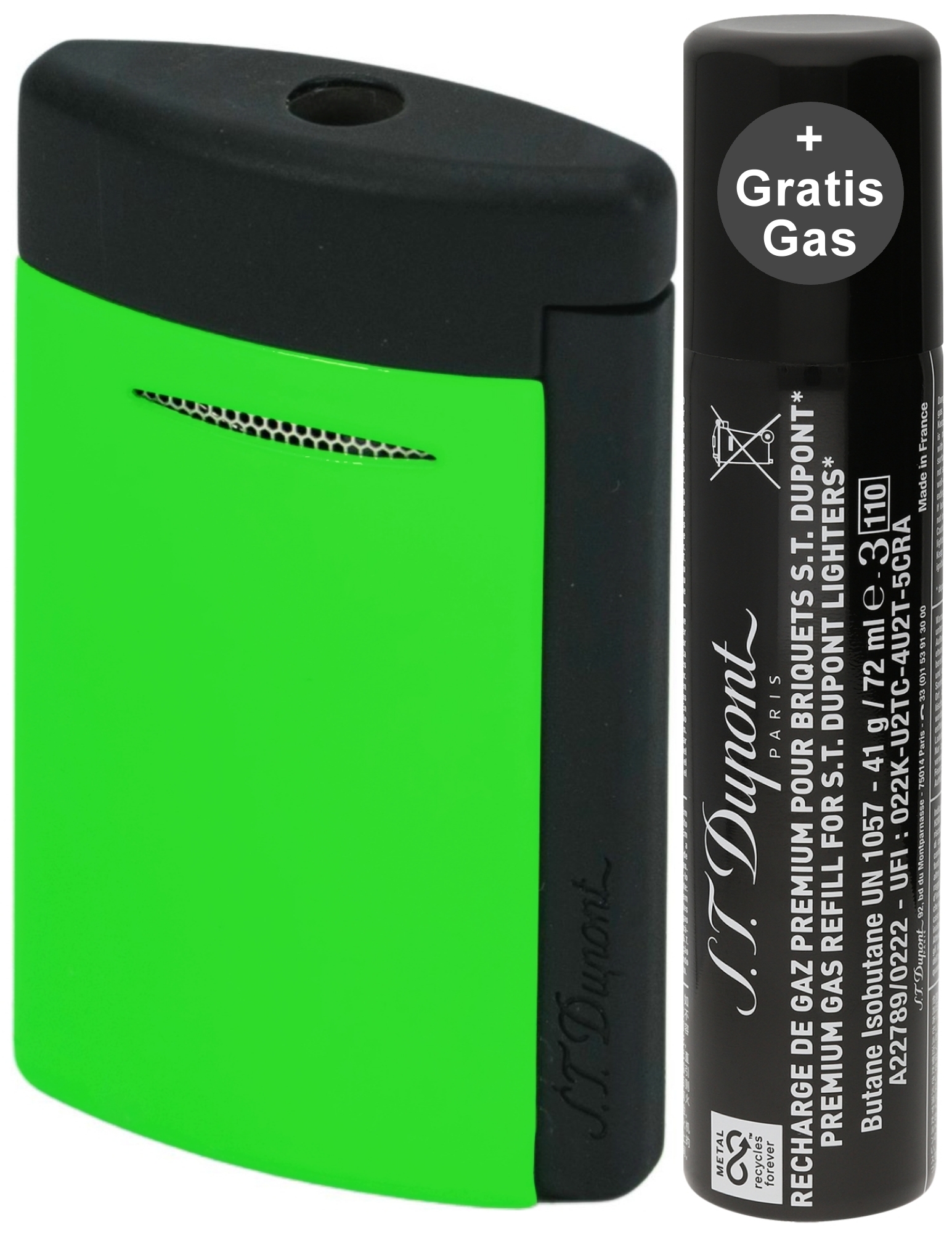 Das Feuerzeug wird mit einer passenden Dose S.T. Dupont Gas schwarz geliefert.Das MiniJet Feuerzeug-Modell besitzt Seiten in einem kräftignen, leuchtenden Grün und wirkt in Verbindung mit einem matt-schwarzem Gehäuse sehr edel.