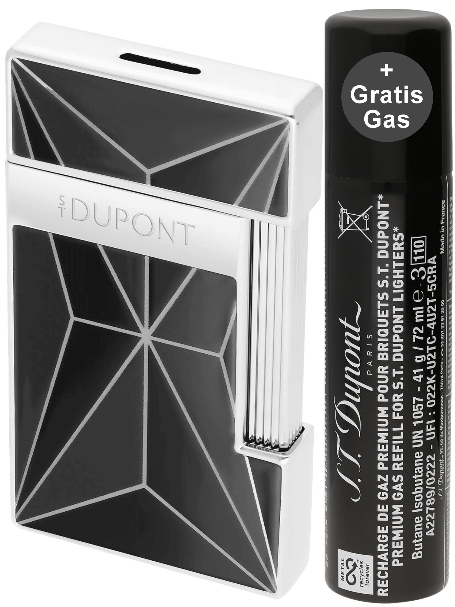 Das Feuerzeug wird mit einer passenden Dose S.T. Dupont Gas schwarz geliefert.Feuerzeug mit neuem S.T. Dupont Logo