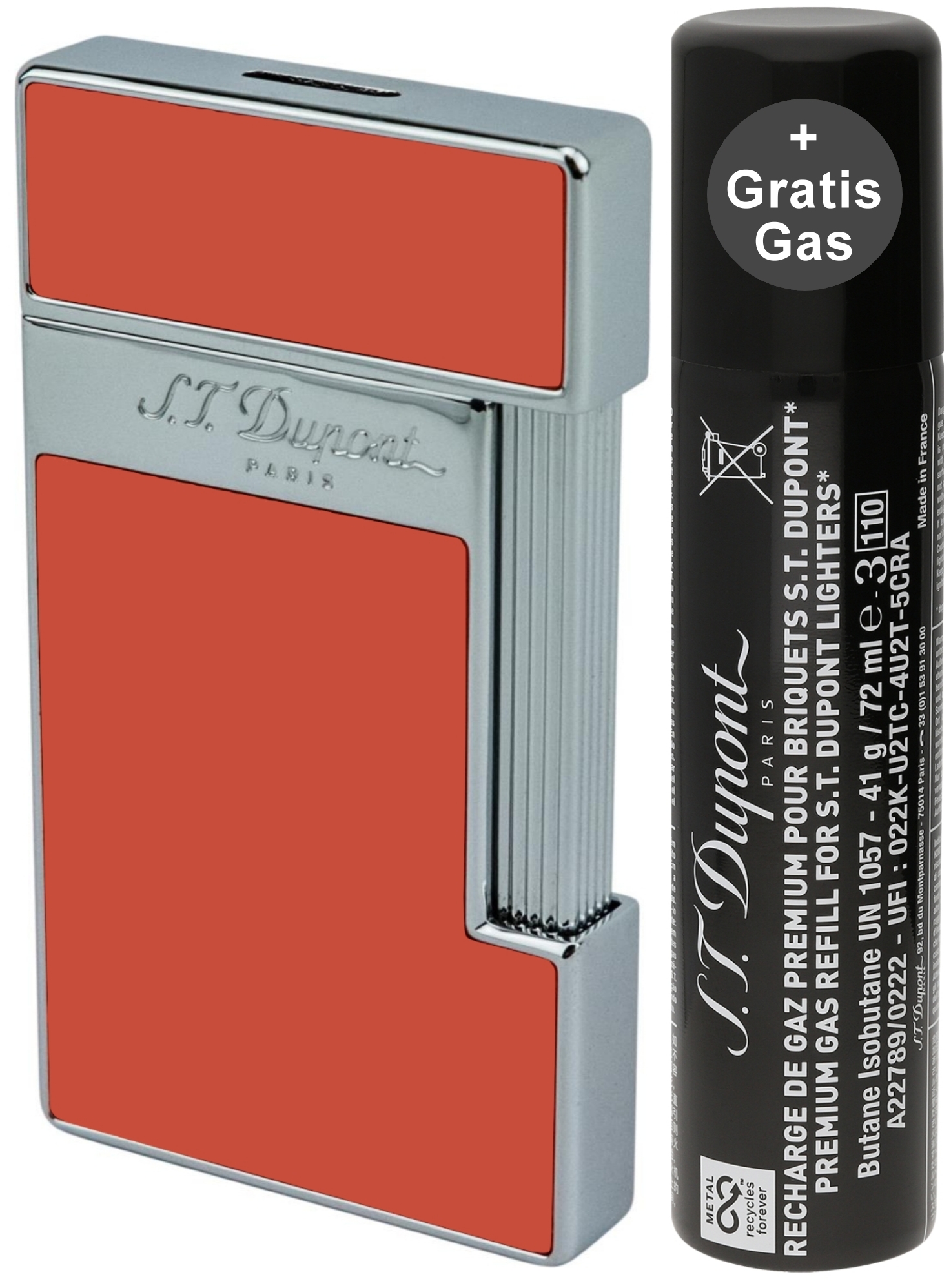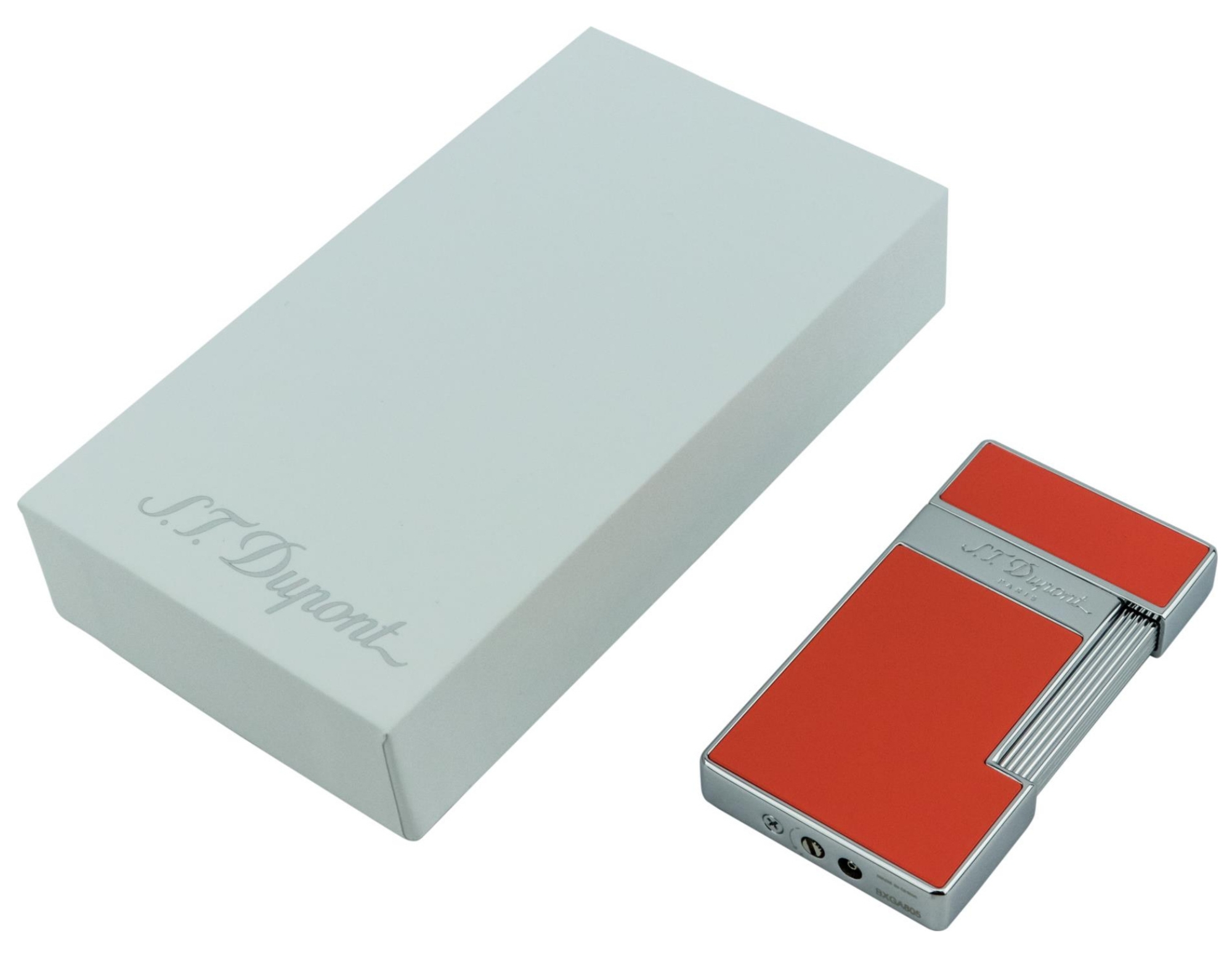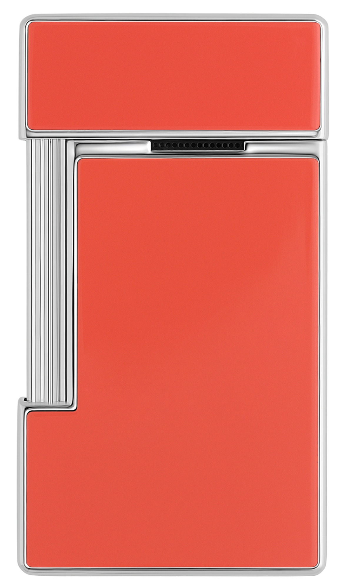 S.T. Dupont der Serie Slimmy im verchromten Gehäuse mit korallenlack-rot lackierten Flächen.Die neue Feuerzeugedition S.T. Dupont Slimmy ist inspiriert von den bekannten Serien Ligne 2 und Slim 7 und vereinigt jeweils das Beste beider Serien.