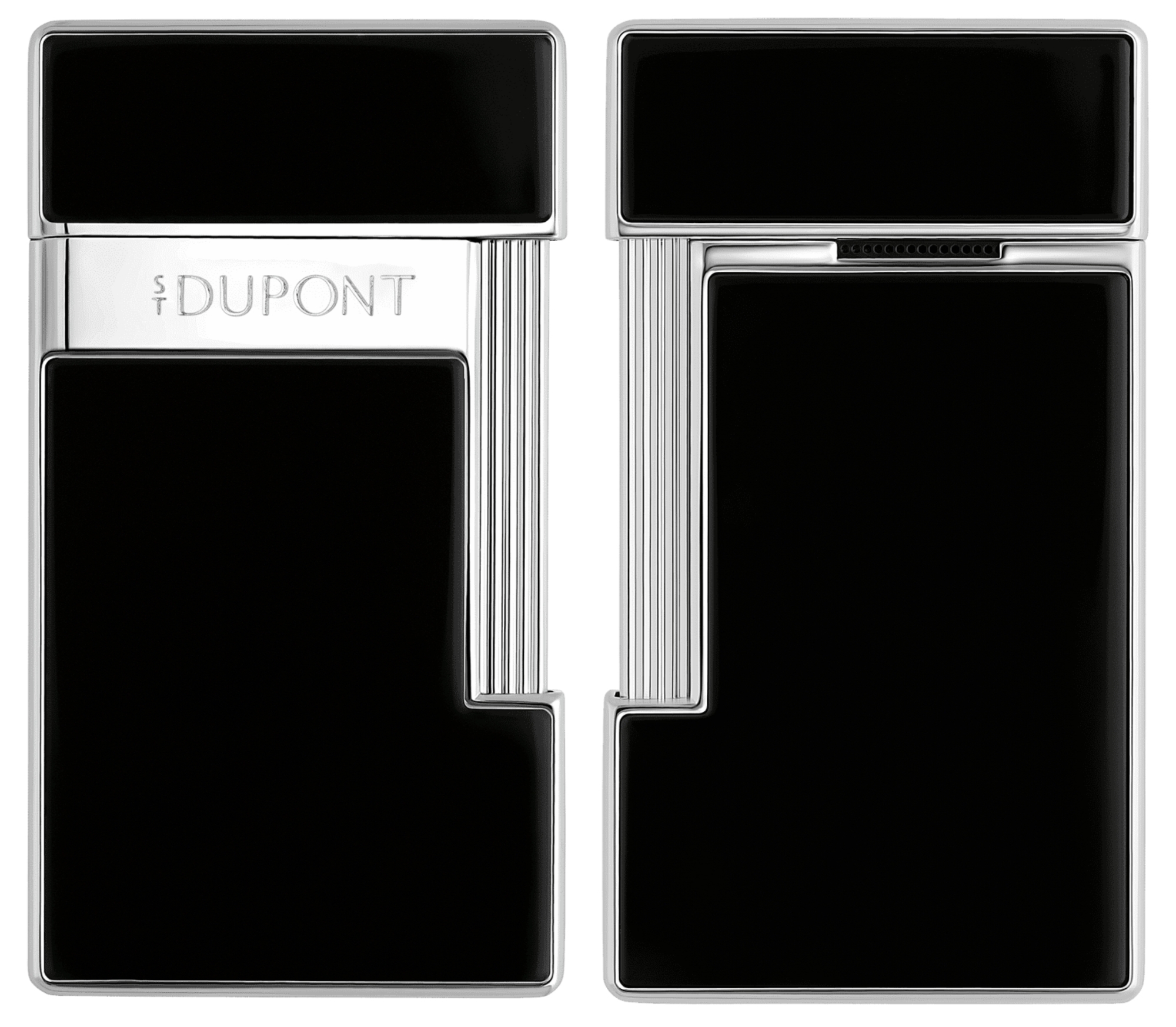 S.T. Dupont der Serie Slimmy im verchromten Gehäuse mit schwarz lackierten Flächen.Die neue Feuerzeugedition S.T. Dupont Slimmy ist inspiriert von den bekannten Serien Ligne 2 und Slim 7 und vereinigt jeweils das Beste beider Serien.