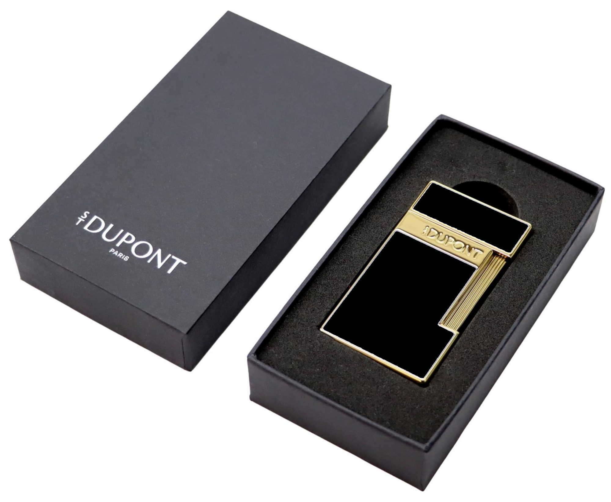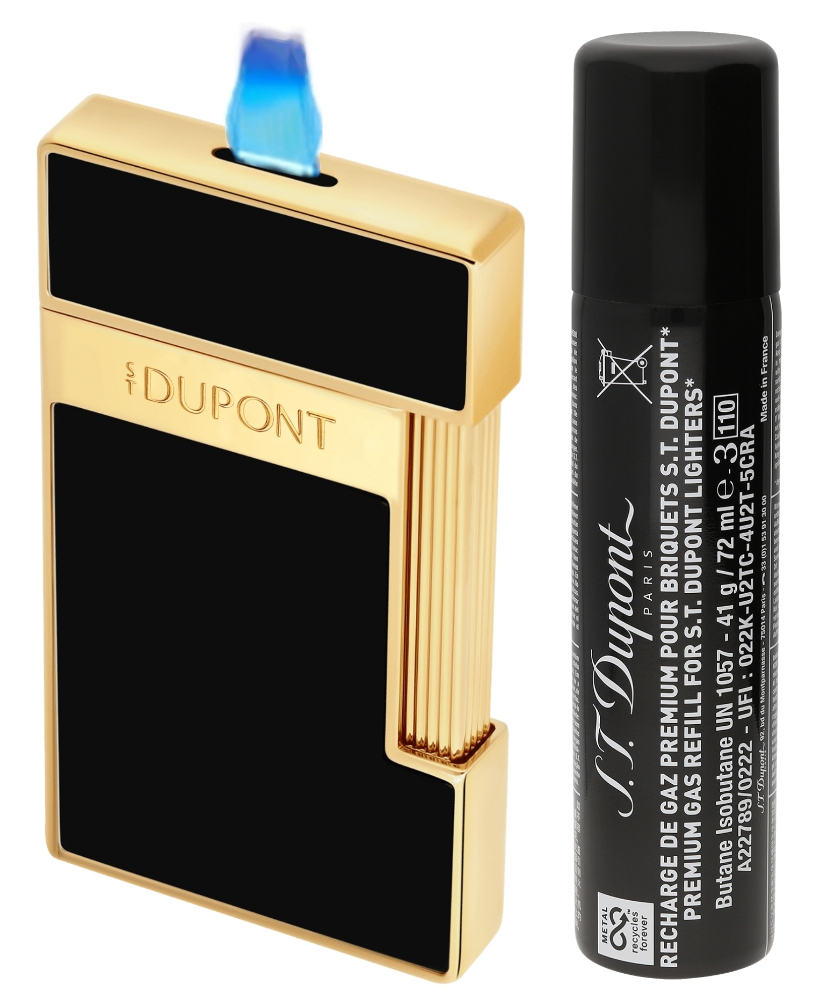 Das Feuerzeug wird im Set mit einer passenden Dose S.T. Dupont Gas schwarz geliefert.S.T. Dupont der Serie Slimmy im klassischen, vergoldeten Gehäuse mit schwarz lackierten Flächen.