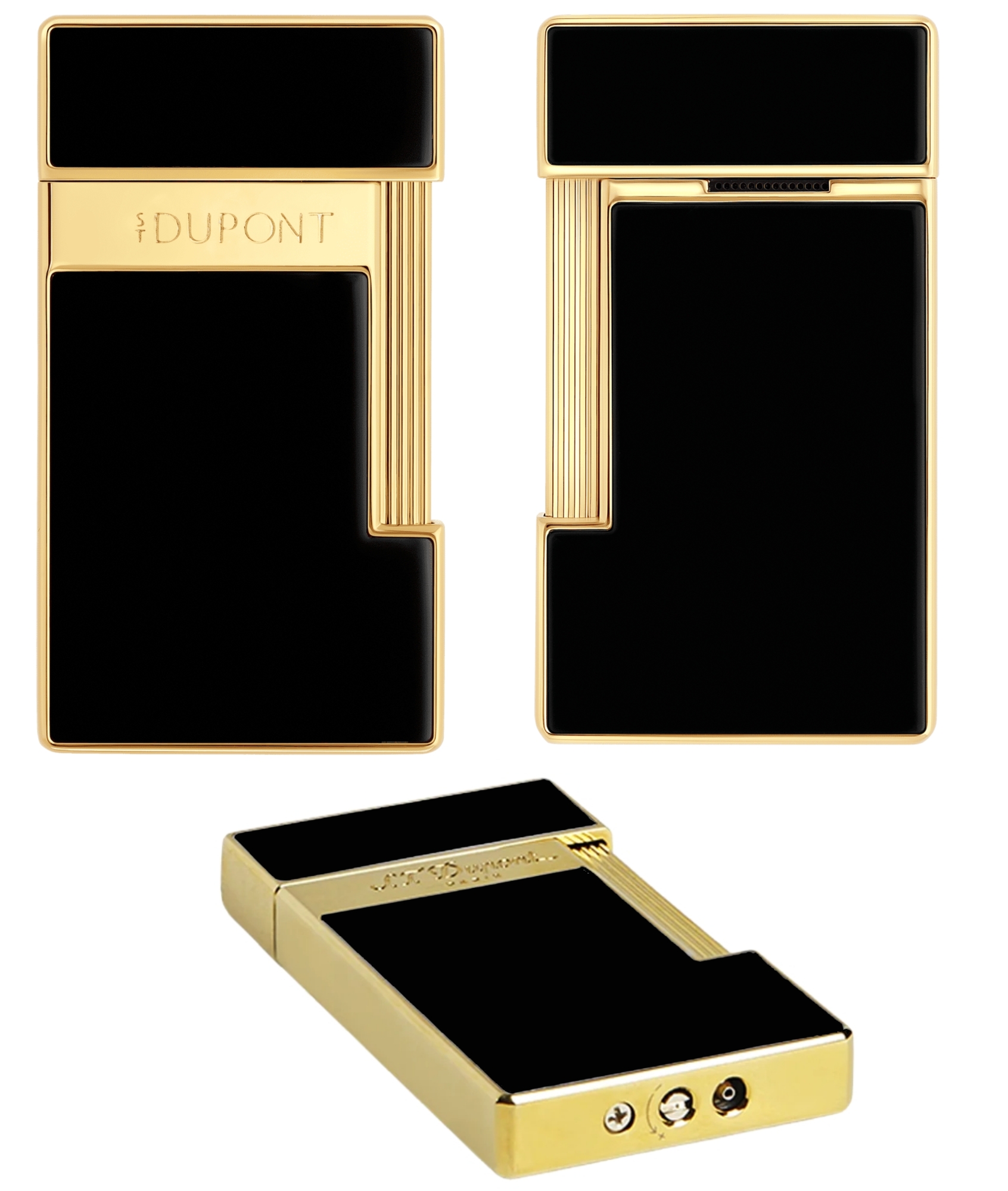 S.T. Dupont der Serie Slimmy im klassischen, vergoldeten Gehäuse mit schwarz lackierten Flächen.Die neue Feuerzeugedition S.T. Dupont Slimmy ist inspiriert von den bekannten Serien Ligne 2 und Slim 7 und vereinigt jeweils das Beste beider Serien.
