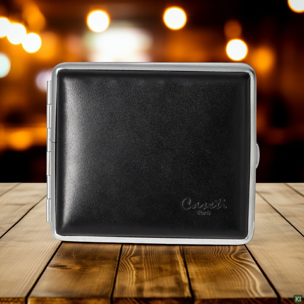 Caseti Zigaretten Etui in Echtleder mit verchromten Metall-Rahmen für 18 Zigaretten mit Gummiband-Halterung.Zigarettenetuis sind im Trend, da sie nicht nur die lästigen Schockbilder auf den Zigarettenschachteln vergessen machen, sondern sie sehen auch noch edel aus. Im Gegensatz zu Zigarrenboxen werden Sie in edlen Materialien und im edlen Design verkauft. Meist sind die klassischen Zigarettenetuis rechteckig, mit abgerundeten Kanten und lassen sich durch Drücken des Verschlussknopfes aufklappen. Im Etui befinden sich geschickte Gummizüge mit denen die Zigaretten festgehalten werden.