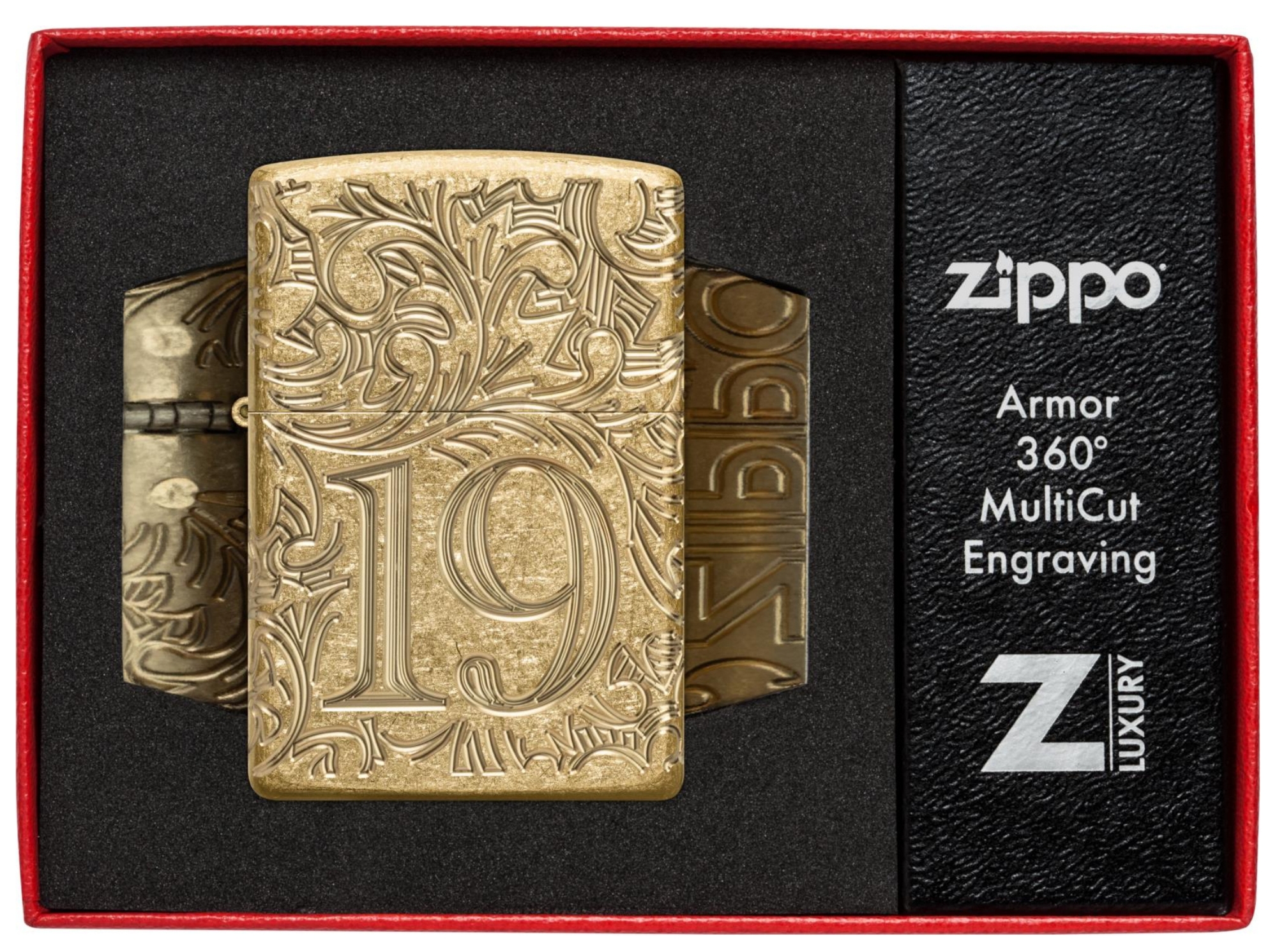 Atemberaubendes Feuerzeuges in getrommeltem Messing mit einer 19 auf der Vorderseite und eine 32 auf der Rückseite. Das Feuerzeug ist außerdem rundherum mit einer Tiefengravur mit einem Blüten-Muster versehen, das mit dem Zippo Deep Carve-Gravurverfahren hergestellt wurde. Das verleiht ihm ein Gefühl von Luxus und Textur. Klassisches Armor Case Zippo Feuerzeug in Tumbled Brass (getrommelten Messing) mit einer Deep Carved 360° (Tiefengravur rund herum). Wie immer bei originalen Zippo Feuerzeugen mit dem besonderen "Click". Das Zippo Sturmfeuerzeug ist windfest, nachfüllbar und wird am besten mit Original Zippo Feuerzeugbenzin betrieben. Zippo Feuerzeuge werden in Bradford, Pennsylvania in den USA hergestellt. Dieses Zippo Feuerzeug wird in einer kleinen Geschenkbox ausgeliefert.- Zippo Markenqualität