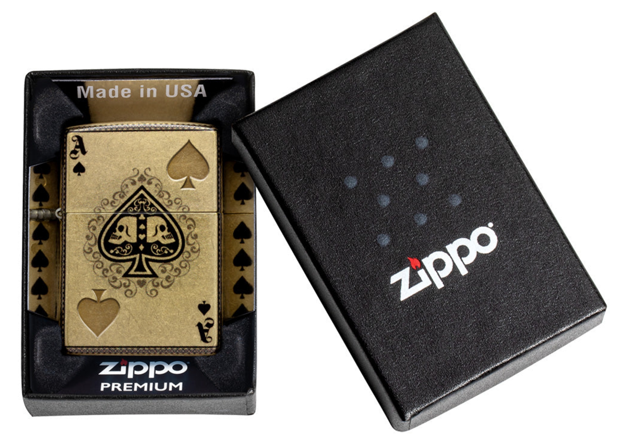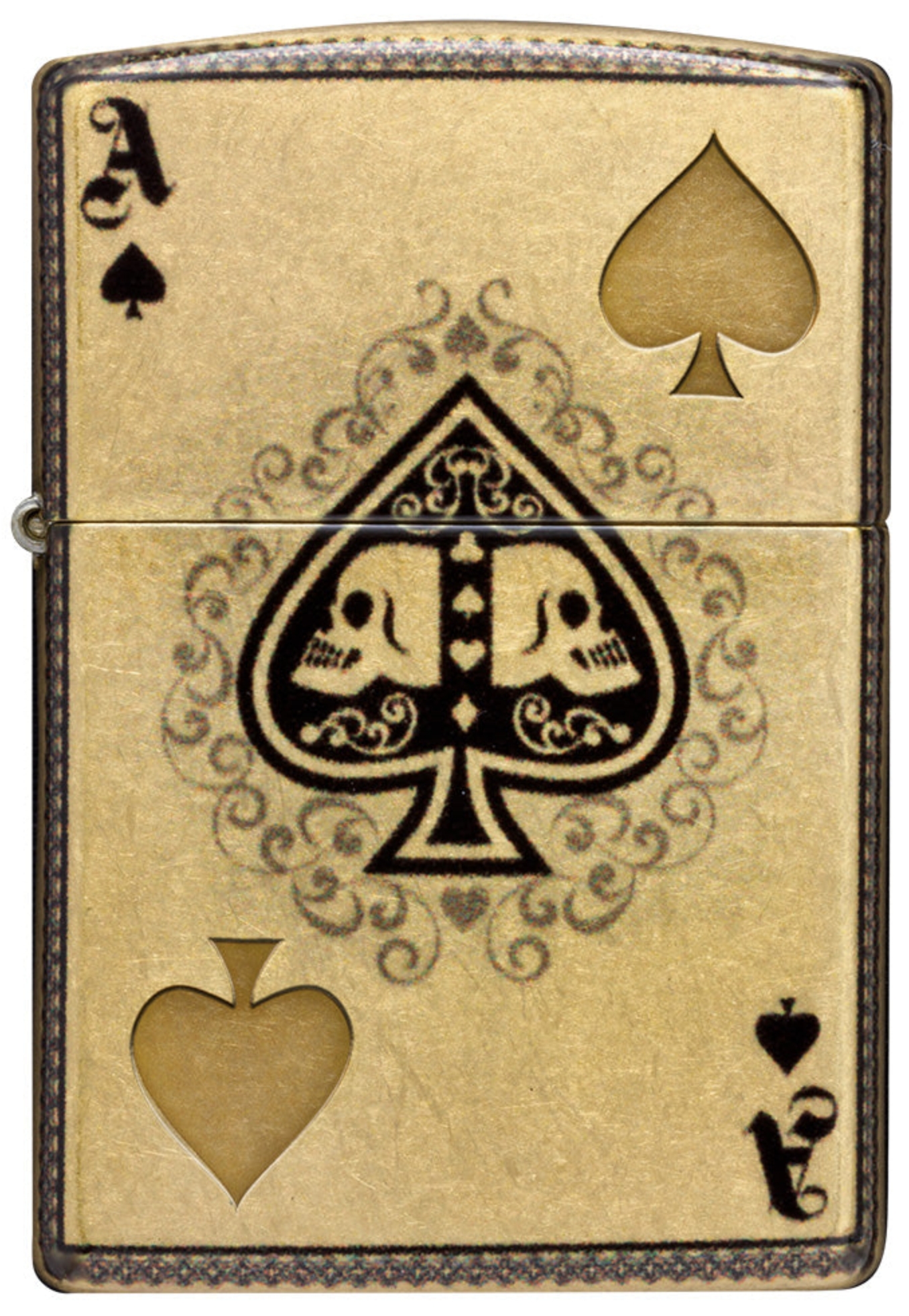 Zippo Ace of Spades Totenkopf Ass Messing Lustre 540° Fusion Sturmfeuerzeug mit Steinzündung und Softflamme