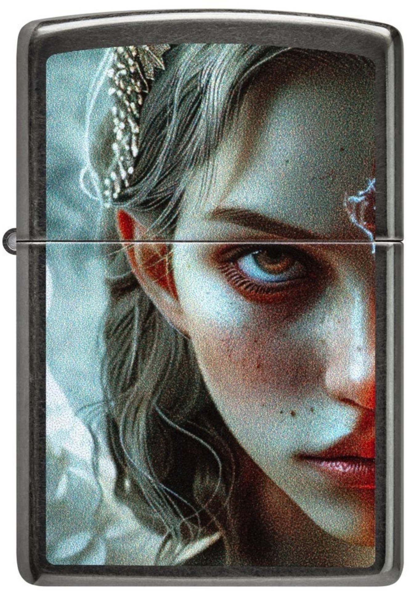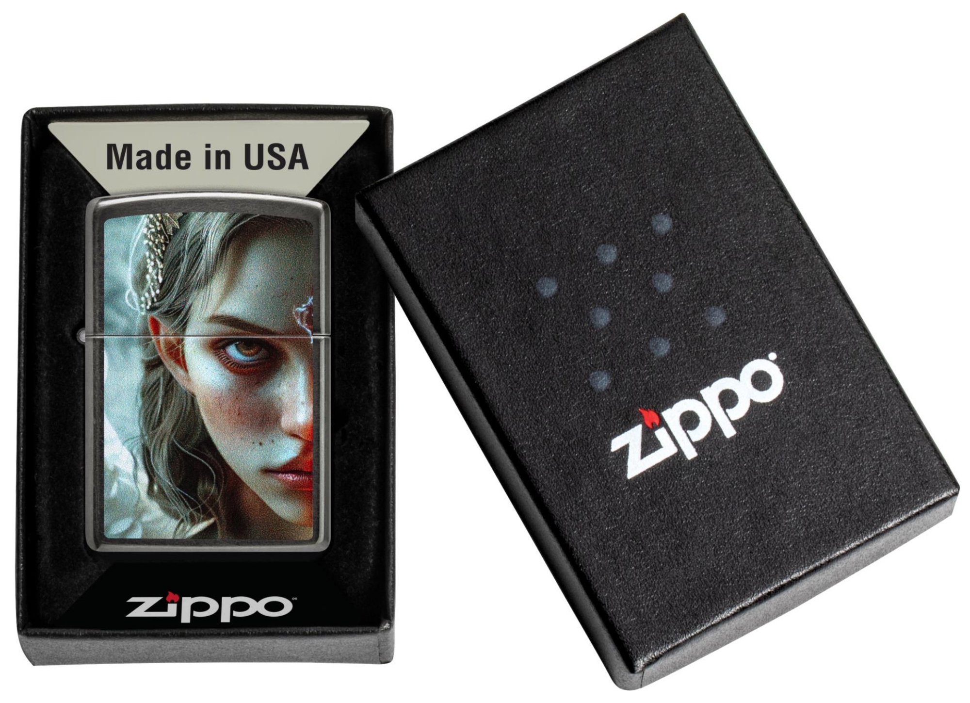 Zippo Angel Devil zeigt ein Bild von einer Frau über zwei Seiten vor einem grau mattem Hintergrund. Das Bild zeigt die zwei Gegensätze Engel und Teufel in perfekter Balance. Auf der Vorderseite ist das halbe Engelsgesicht einer Frau zu sehen, auf der Rückseite das halbe Teufelsgesicht. Die Bilder werden von einem matten, grauen Gehäuse umgeben. Die Dualität der menschlichen Natur wird auf diesem klassischen grauen Feuerzeug perfekt wiedergegeben. Klassisches Zippo im grau matt lackiertem Feuerzeuggehäuse versehen mit einem beidseitigen Color Image Druck (Farb Druck).Wie immer bei originalen Zippo Feuerzeugen mit dem besonderen "Click". Das Zippo Sturmfeuerzeug ist windfest, nachfüllbar und wird am besten mit Original Zippo Feuerzeugbenzin betrieben. Zippo Feuerzeuge werden in Bradford, Pennsylvania in den USA hergestellt. Dieses Zippo Feuerzeug wird in einer kleinen Geschenkbox ausgeliefert.