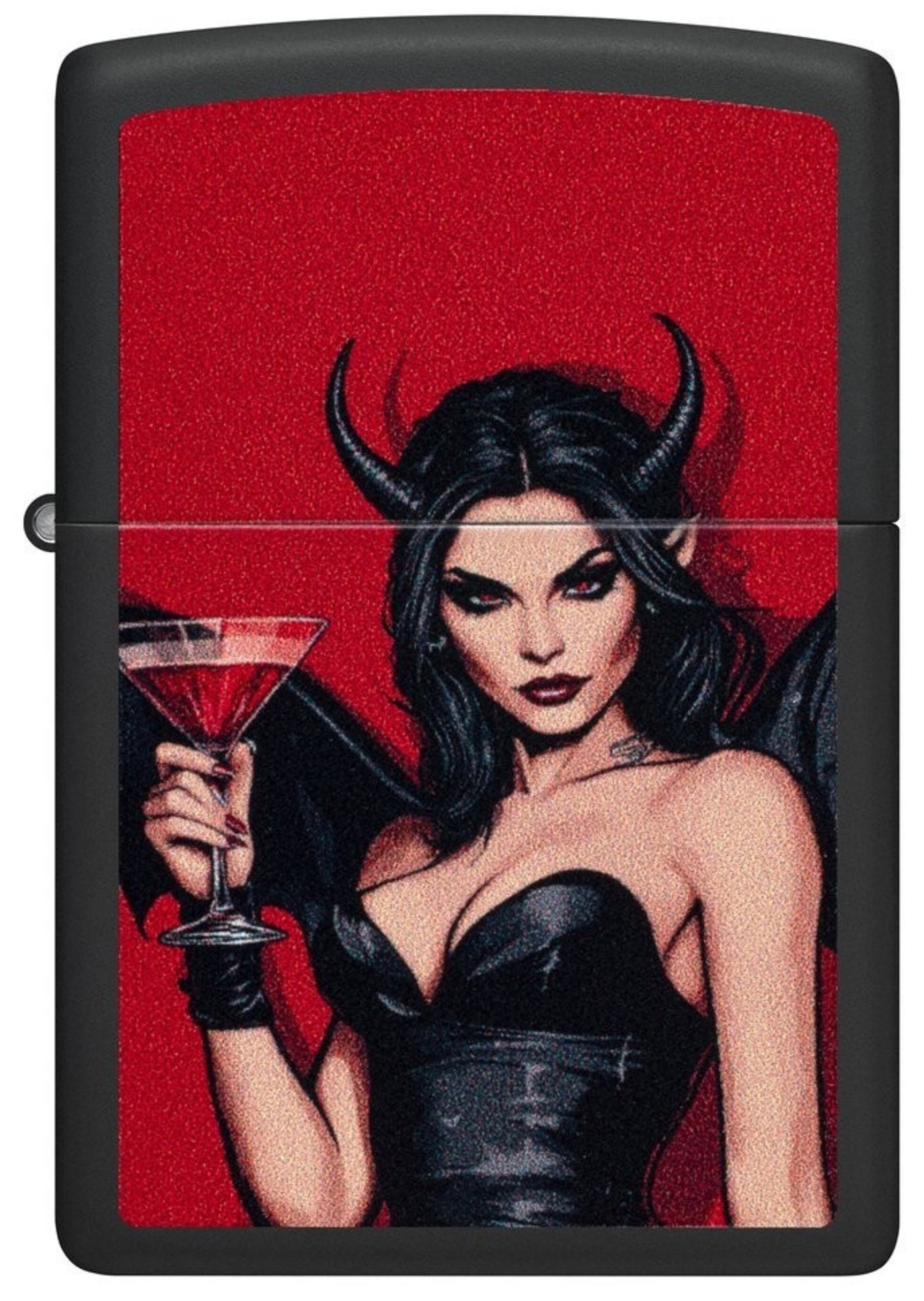 Zippo Devil Vampire zeigt ein Bild von einer Teufels Vampire Lady, schwarz gekleidet mit einem Blut-Cocktail vor einem roten Hintergrund. Die Vampire Lady besitzt Teufelshörner und Teufelsflügel und hält das Cocktailglas in der Hand. Das Bild auf rotem Grund wird von einem matt schwarzen Gehäuse umgeben. Klassisches Zippo im schwarz matt lackiertem Feuerzeuggehäuse versehen mit einem Color Image Druck (Farb Druck).Wie immer bei originalen Zippo Feuerzeugen mit dem besonderen "Click". Das Zippo Sturmfeuerzeug ist windfest, nachfüllbar und wird am besten mit Original Zippo Feuerzeugbenzin betrieben. Zippo Feuerzeuge werden in Bradford, Pennsylvania in den USA hergestellt. Dieses Zippo Feuerzeug wird in einer kleinen Geschenkbox ausgeliefert.