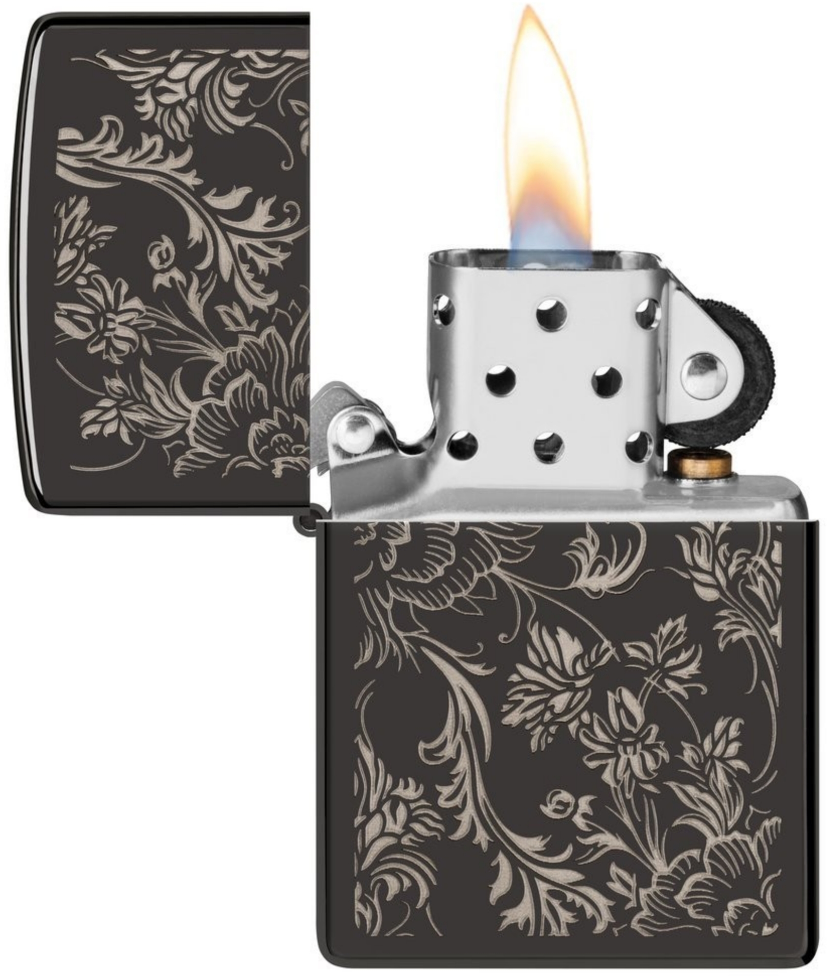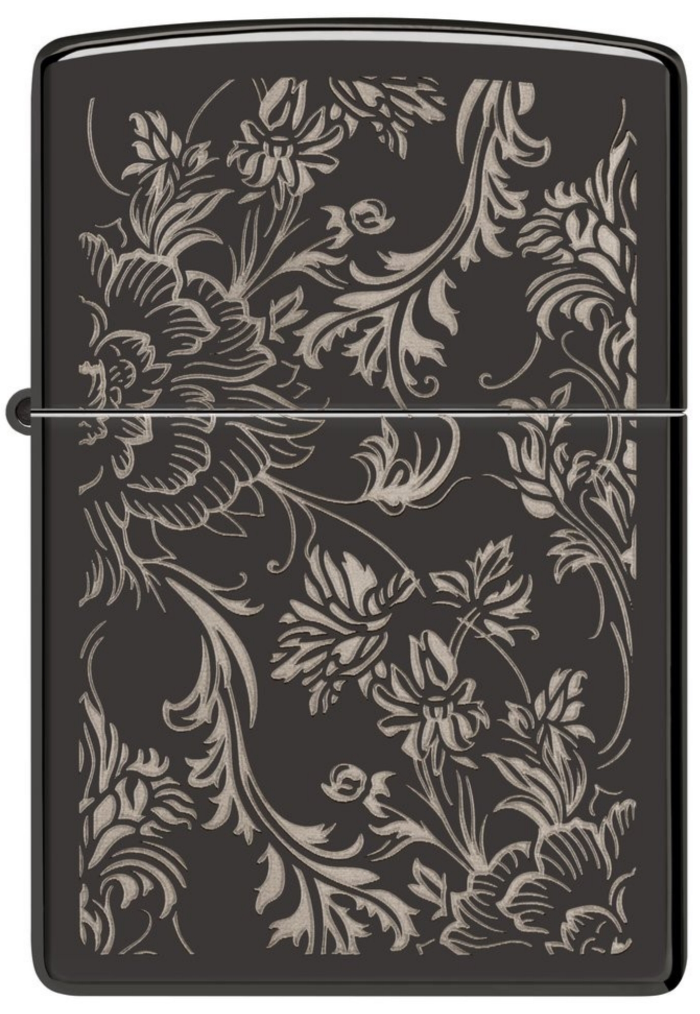 Zippo Filigree Blumenranken schwarz hochglänzend poliert mit Laser Gravur - Sturmfeuerzeug mit Steinzündung und Softflamme