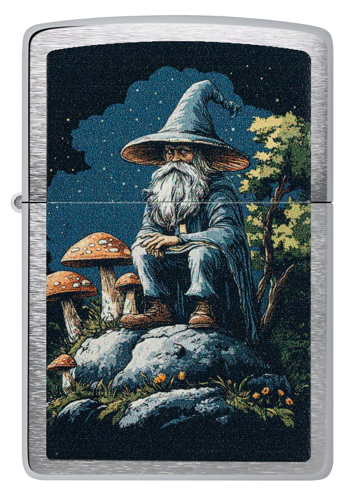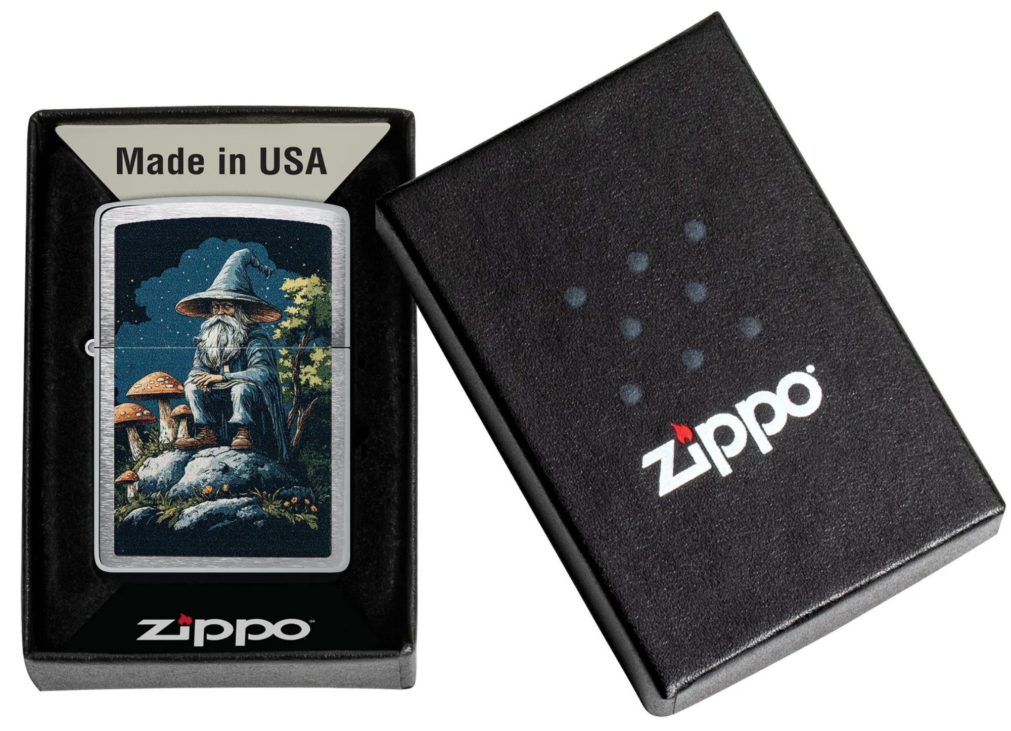 Zippo Gartenzwerg mit Bild eines Märchen-Zauberers als Gartenzwerk auf einem klassischen Feuerzeug in Brushed Chrome. Ein alter, von der Witterung gezeichneter Zauberer-Gartenzwerk sitzt auf einem Felsen zwischen Pilzen und Blattwerk. Das Feuerzeug ist in Brushed Chrome, das Bild ist per Color Image auf der Frontseite aufgedruckt. Wie immer bei originalen Zippo Feuerzeugen mit dem besonderen "Click". Das Zippo Sturmfeuerzeug ist windfest, nachfüllbar und wird am besten mit Original Zippo Feuerzeugbenzin betrieben. Zippo Feuerzeuge werden in Bradford, Pennsylvania in den USA hergestellt. Dieses Zippo Feuerzeug wird in einer kleinen Geschenkbox ausgeliefert.- Zippo Markenqualität