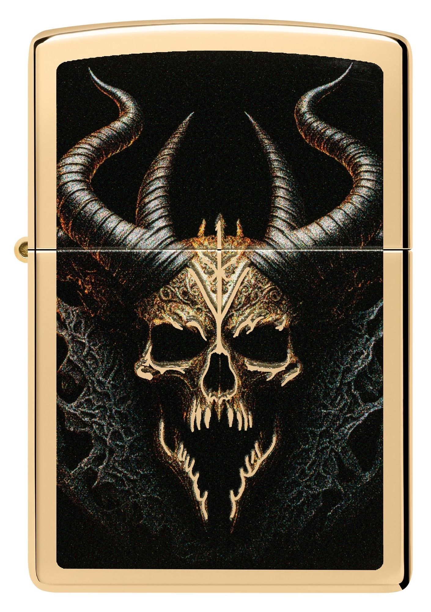 Das Zippo Horror Skull Feuerzeug zeigt einen furchterregender Totenschädel mit bedrohlichen Hörnern auf einem Gehäuse im poliertem Messing . Das Bild zeigt den Horror Skull vor einem unheimlichen, düsteren Hintergrund. Das Gehäuse in High Polish Brass ist mit einem Color Image Druck versehen. Wie immer bei originalen Zippo Feuerzeugen mit dem besonderen Click. Das Zippo Sturmfeuerzeug ist windfest, nachfüllbar und wird am besten mit Original Zippo Feuerzeugbenzin betrieben. Zippo Feuerzeuge werden in Bradford, Pennsylvania in den USA hergestellt. Dieses Zippo Feuerzeug wird in einer kleinen Geschenkbox ausgeliefert.- Zippo Markenqualität