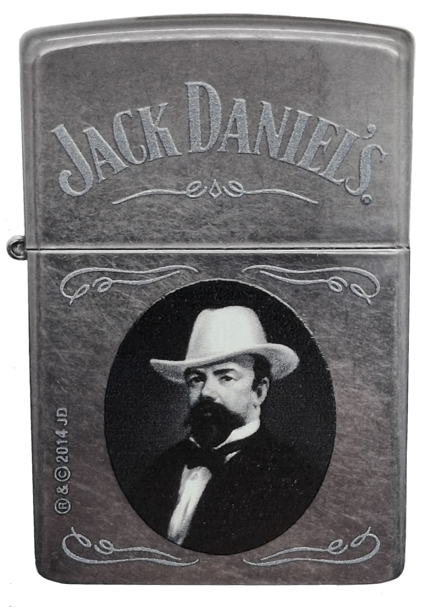 Das Feuerzeug in Gray Dusk (gunfarbend) besitzt ein altes schwarz-weiss Foto vom Firmengründer und Namensgeber Jasper Newton "Jack" Daniel. Das ovale Foto wurde zentral in Szene gesetzt, darüber schwebt der Schriftzug "JACK DANIEL'S". Neben dem Foto ist ein Schruftzug "® & © 2014 JD" angebtacht.