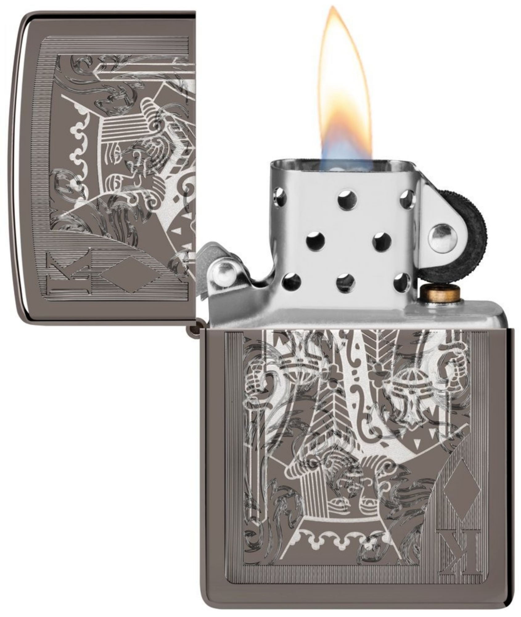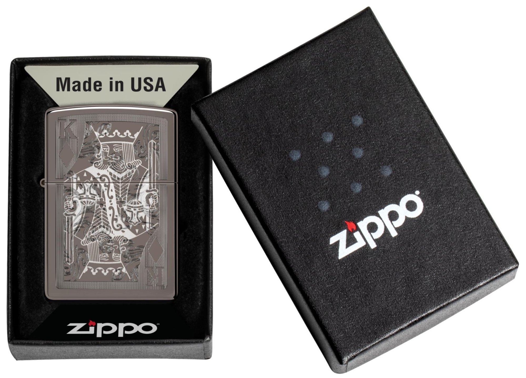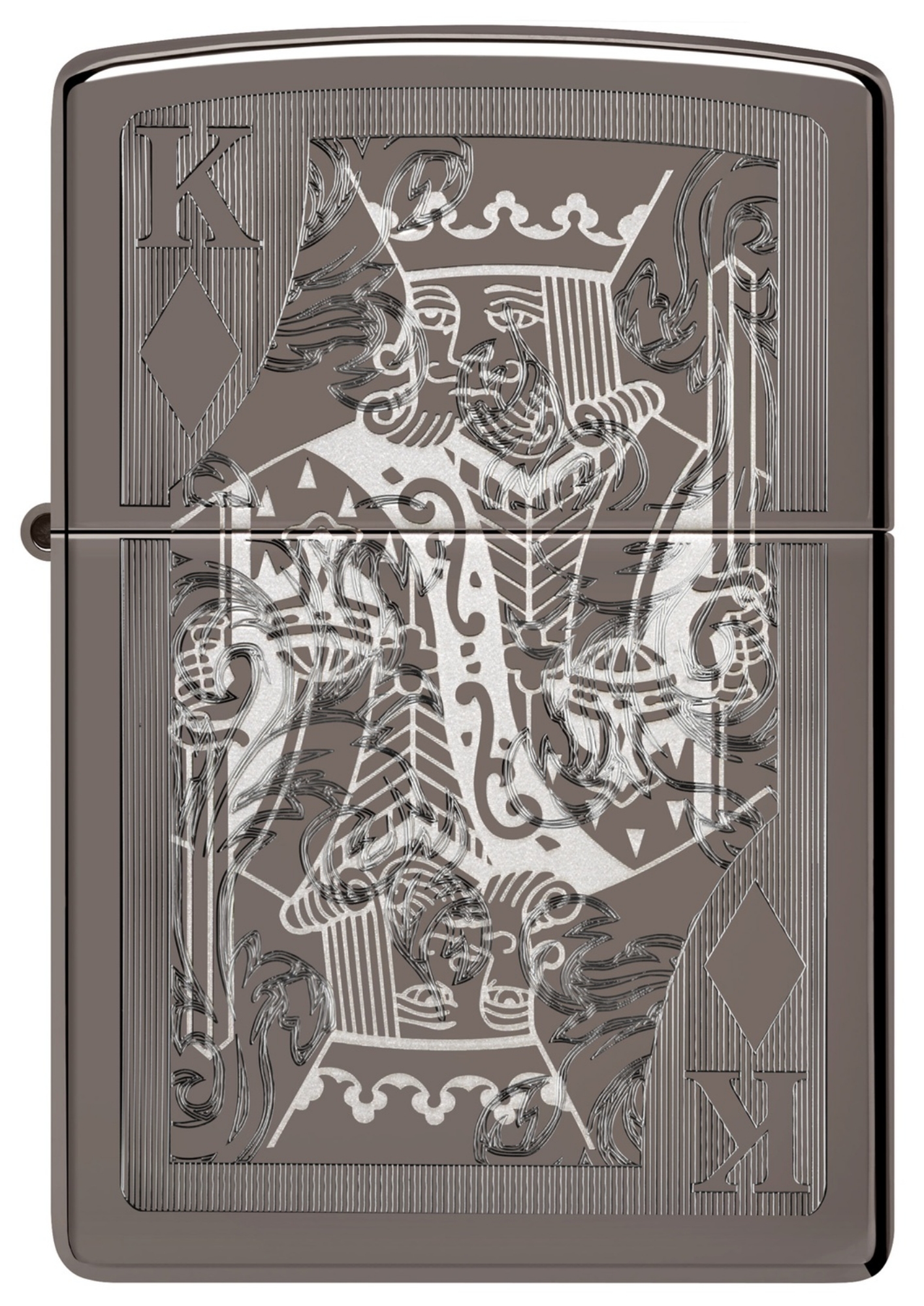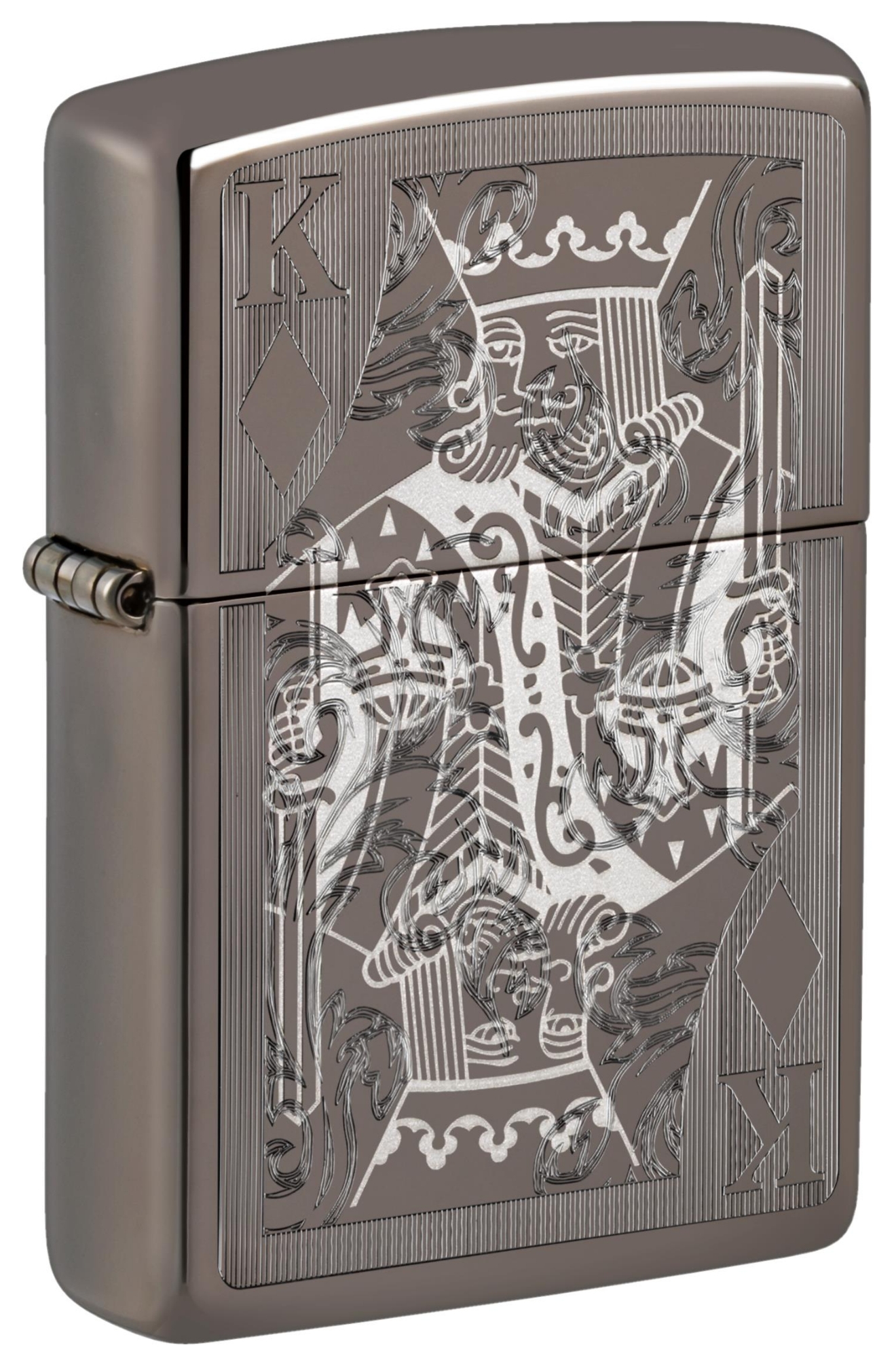 Zippo Kings of Diamonds Karo König in Black Ice mit Laser-Gravur Sturmfeuerzeug mit Steinzündung und Softflamme