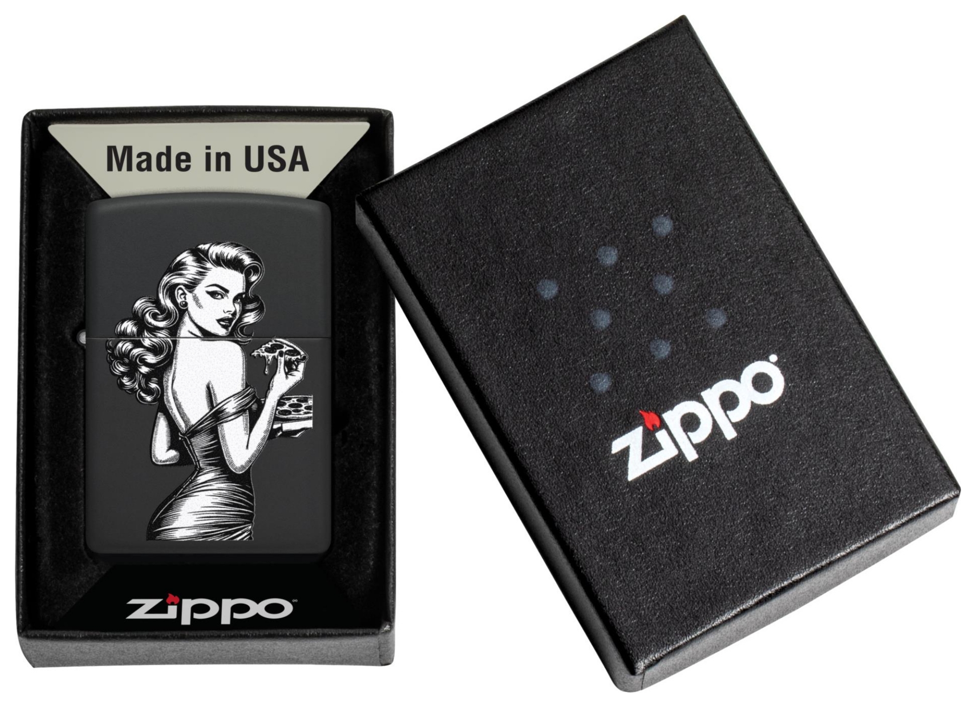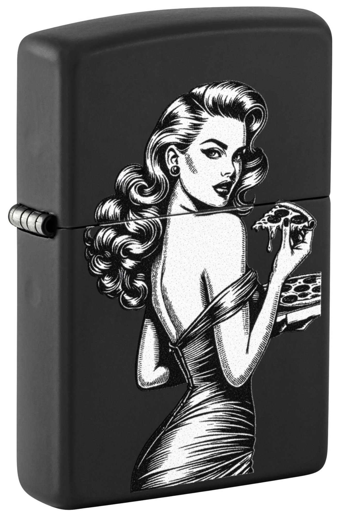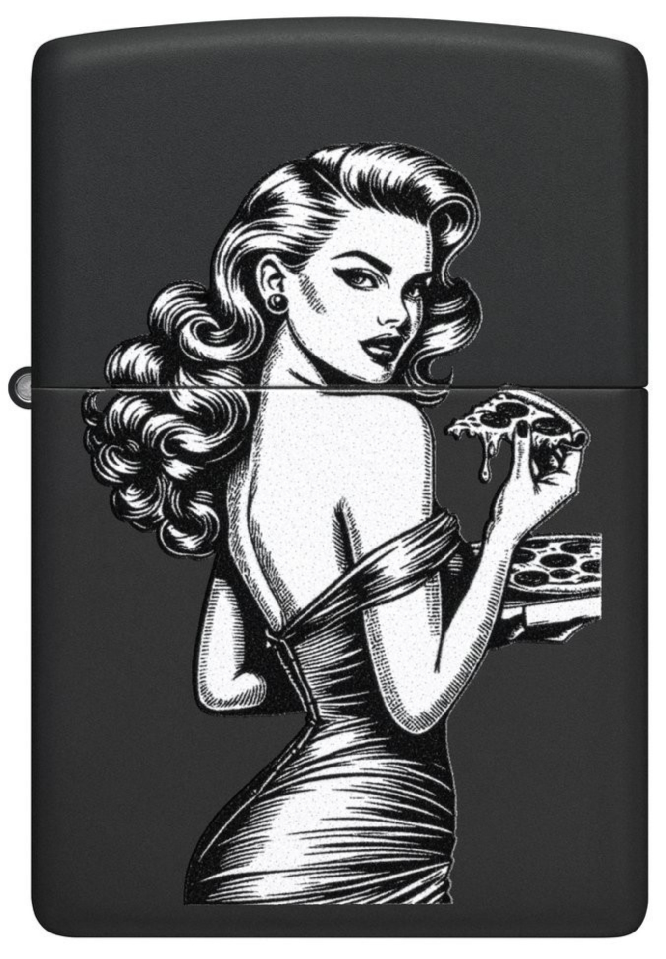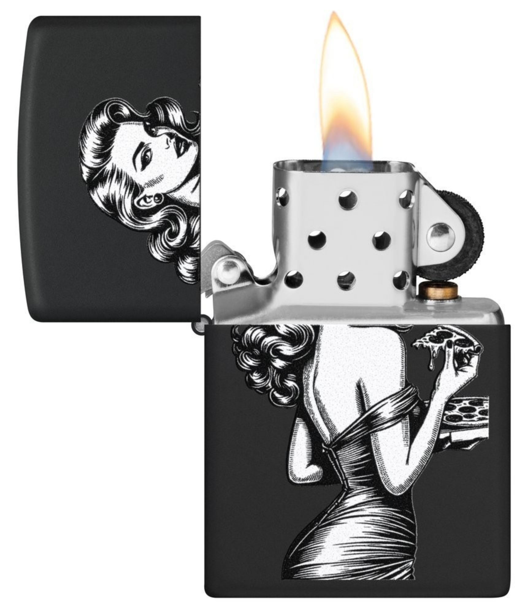 Zippo Pinup with Pizza schwarz matt Feuerzeug offen - © raucher-xxl.de