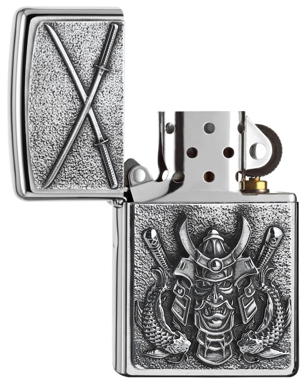 Zippo Samurai chrom gebürstet mit Emblem Feuerzeug offen - © raucher-xxl.de