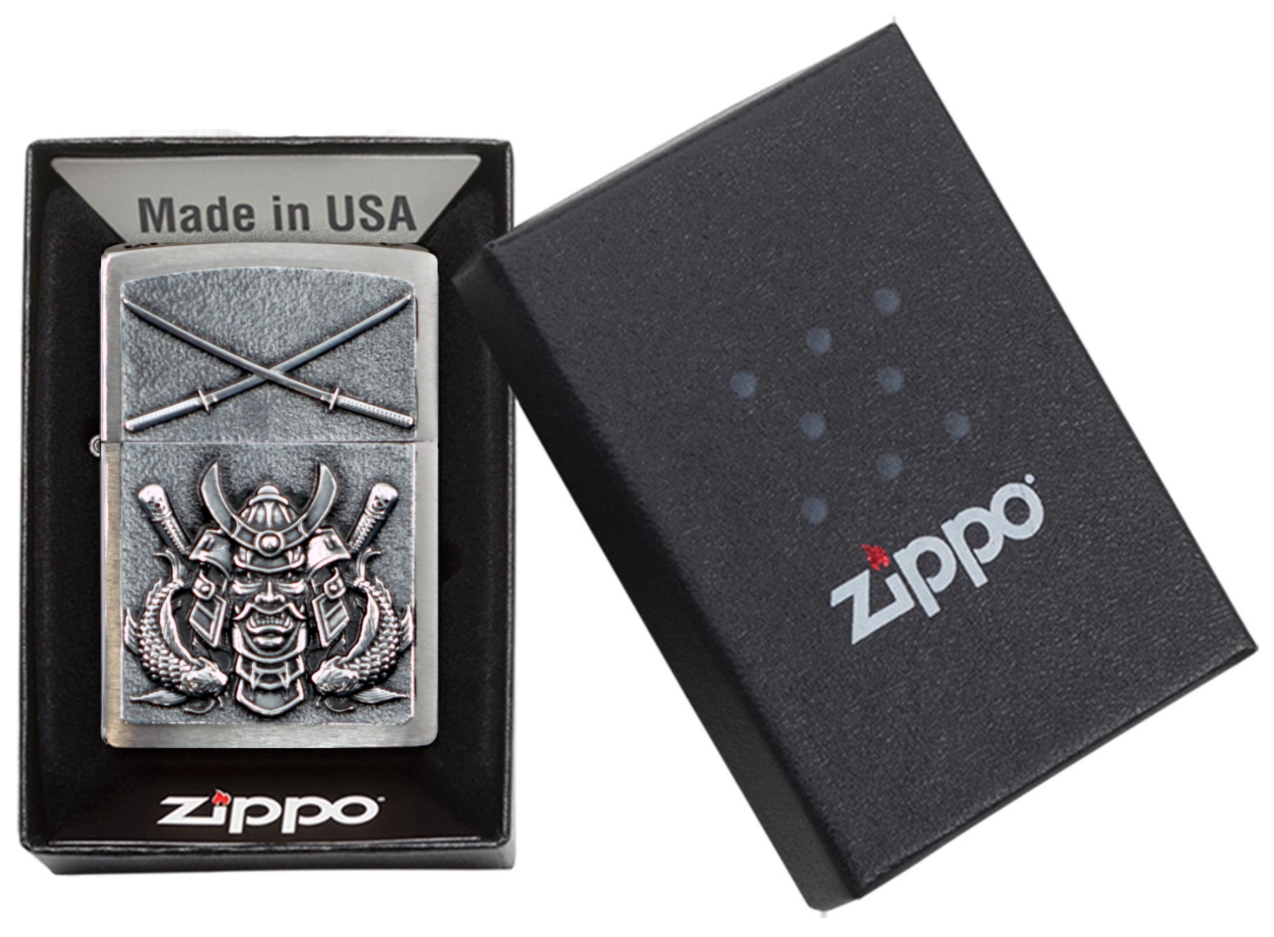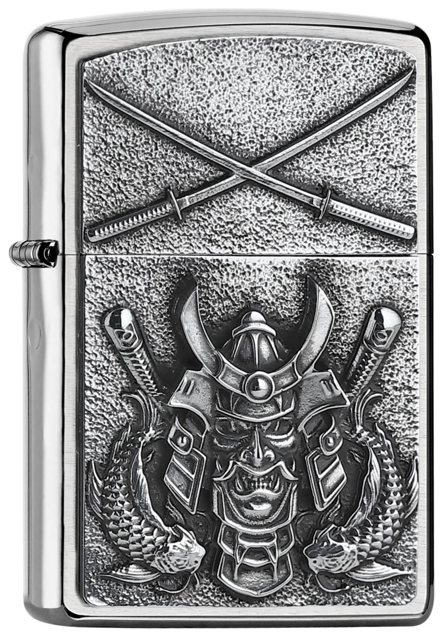 Zippo Samurai chrom gebürstet mit Emblem - Sturmfeuerzeug mit Steinzündung und Softflamme