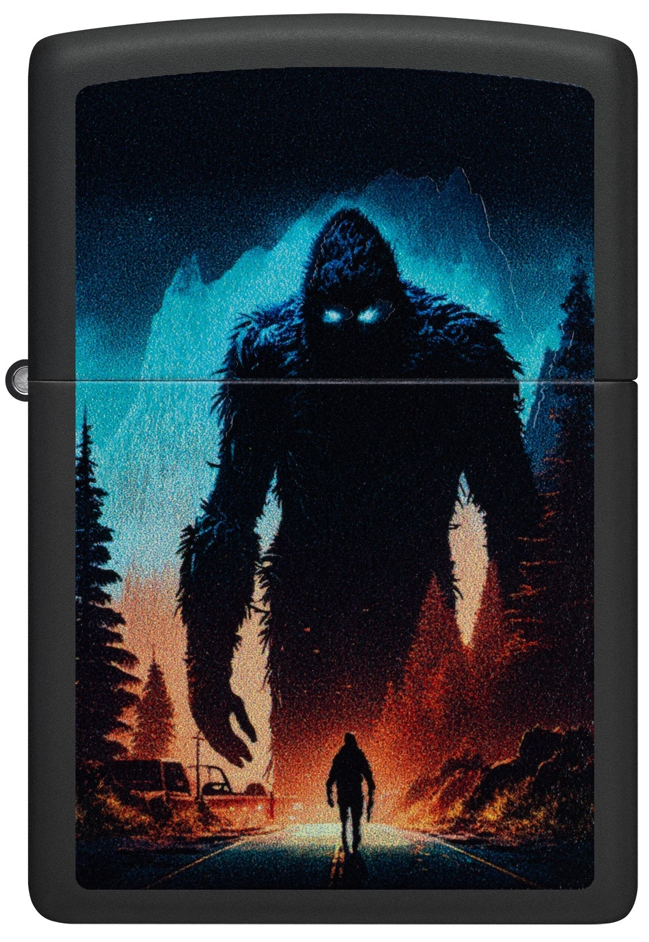 Zippo Sasquatch Bigfoot zeigt einen riesigen Sasquatch Bigfoot im Hintergrund über einer mondbeschienenen Straße. Das mystische Bild ist mit Black Light Druck hergestellt, leuchtet also bläulich bei Schwarzlicht. Das Bild wird außerdem von einem matt schwarzen Gehäuse umgeben. Klassisches Zippo im schwarz matt lackierten Feuerzeuggehäuse mit einem Color Image Druck. Wie immer bei originalen Zippo Feuerzeugen mit dem besonderen "Click". Das Zippo Sturmfeuerzeug ist windfest, nachfüllbar und wird am besten mit Original Zippo Feuerzeugbenzin betrieben. Zippo Feuerzeuge werden in Bradford, Pennsylvania in den USA hergestellt. Dieses Zippo Feuerzeug wird in einer kleinen Geschenkbox ausgeliefert.- Zippo Markenqualität