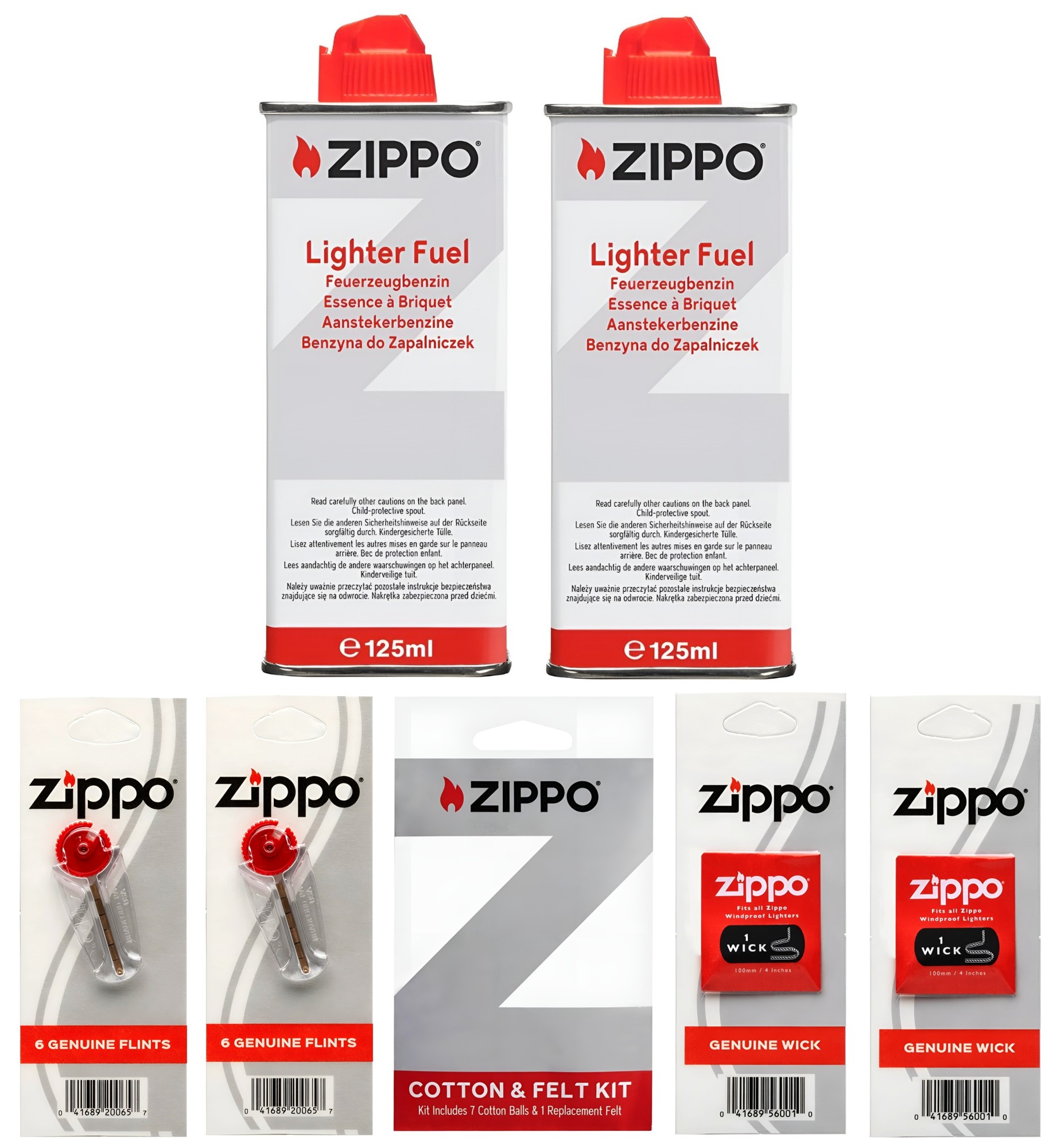 Dazu 2 Packungen mit 6 Zippo Feuersteine, 2 Packungen a 1 Zippo Docht und eine Packung mit Zippo Watte+Filz.