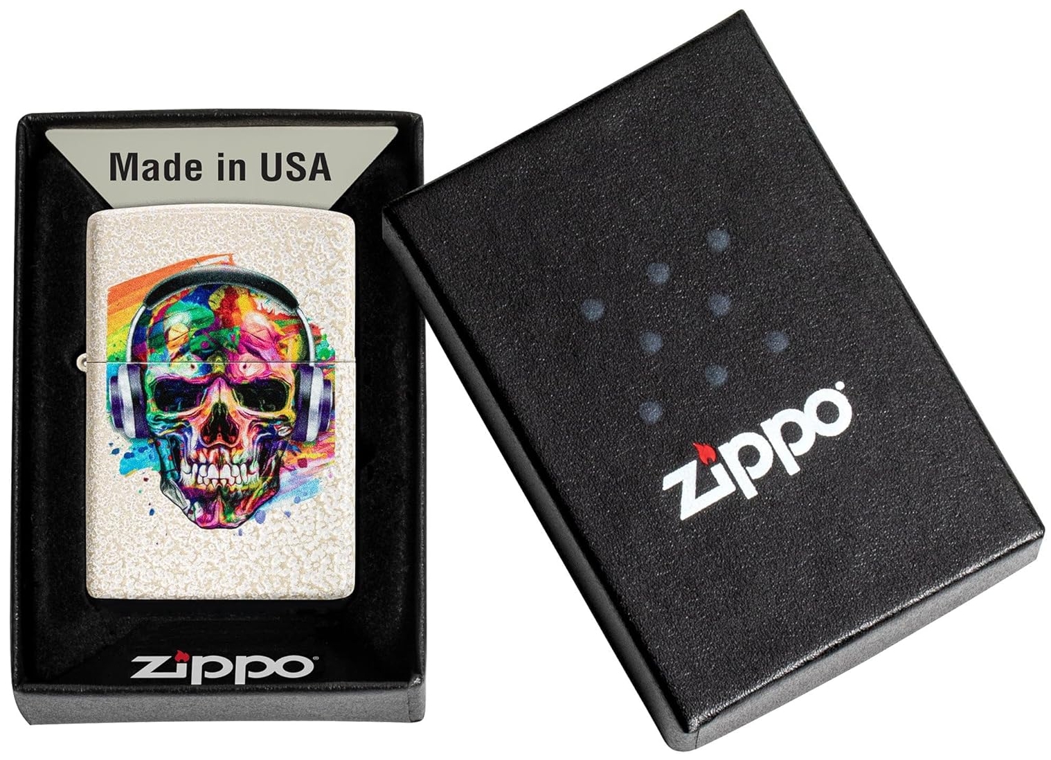 Zippo Skull Headphones Design Mercury Glas weiß mit Color Image Druck - Sturmfeuerzeug mit Steinzündung und Softflamme