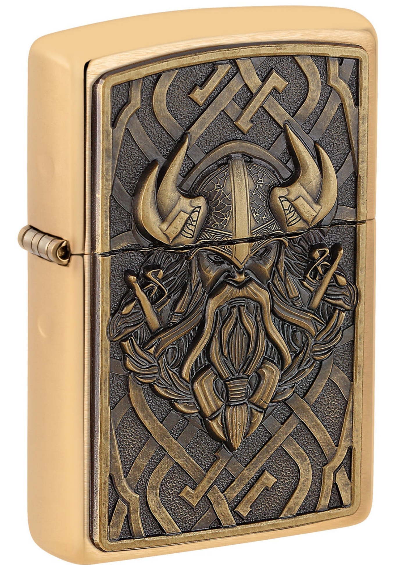 Exklusives Zippo Sammlerstück - Beschwören Sie die Stärke und den Mut des Wikingergeistes herauf.Das Emblem zeigt ein aufwendig gestaltetes Wikingerporträt umgeben von einem traditionellen nordischen Knotenmuster. Der Wikingerkrieger mit Helm, Runen und Schwertmotiven besticht durch seine detailreiche Gravur auf dem luxuriösen Emblem. Die spezielle Antique Brass Beschichtung verleiht dem Feuerzeug eine authentische, antike Optik. Auch das Messing Gehäuse wurde mit dieser Antique Brass Beschichtung versehen.