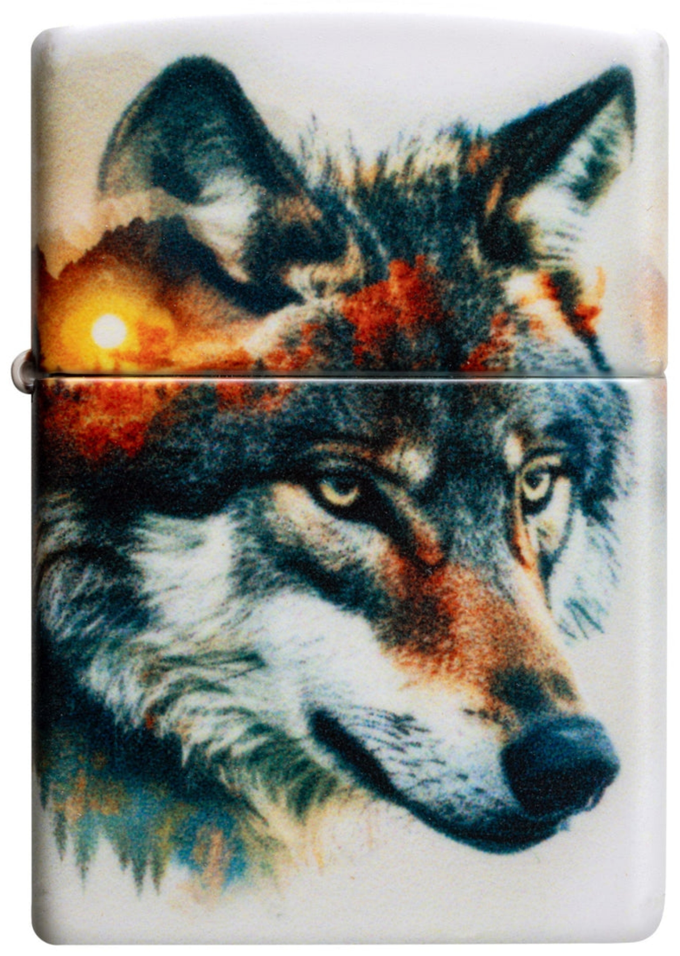 Wolf and Mountain ist ein Feuerzeug mit einem Wolf in einer Bergumgebung in einem Bild, das sich um das Feuerzeug schlängelt. Auf der Vorderseite ist ein farbiger Wolskopf zu sehen, die lebendige, farbige Landschaft ist eher auf den Seiten und auf der Rückseite angebracht. Alle Seiten des Feuerzeuges sind mit dem 540° Color Druck bedeckt. Wie immer bei originalen Zippo Feuerzeugen mit dem besonderen "Click". Das Zippo Sturmfeuerzeug ist windfest, nachfüllbar und wird am besten mit Original Zippo Feuerzeugbenzin betrieben. Zippo Feuerzeuge werden in Bradford, Pennsylvania in den USA hergestellt. Dieses Zippo Feuerzeug wird in einer kleinen Geschenkbox ausgeliefert.- Zippo Markenqualität